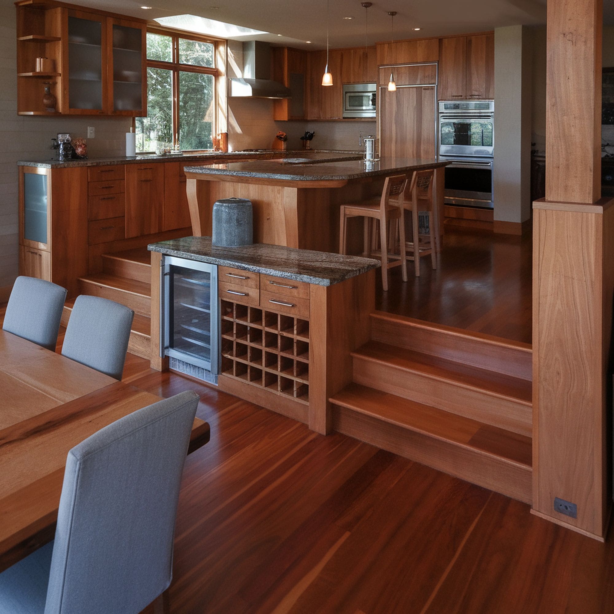 Kitchens and dining rooms in split-level homes are often minimally separated by the use of a few stairs. Despite the level difference, these two areas blend together elegantly in a larger open-space area. Using different materials for the flooring may not be a good idea because there’s a risk of creating a dated look. Maintain visual cohesiveness by relying on the same flooring style for each distinctive level.