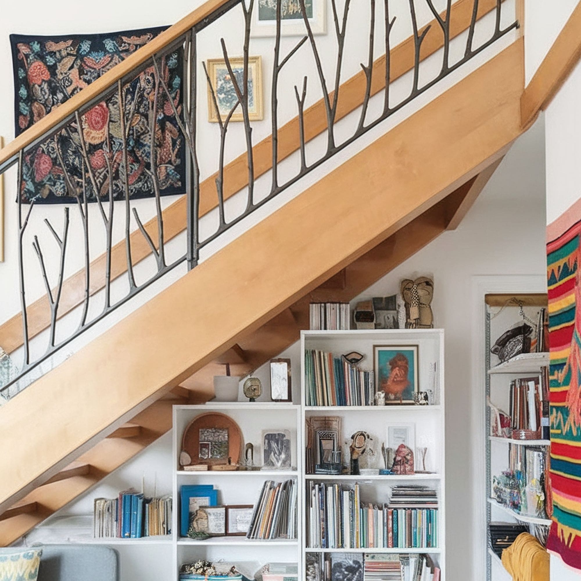 The organic look is complemented beautifully by the warm tones of wood used. This combination results in a whimsical railing style that goes well together with the colorful under-the-stairs area.