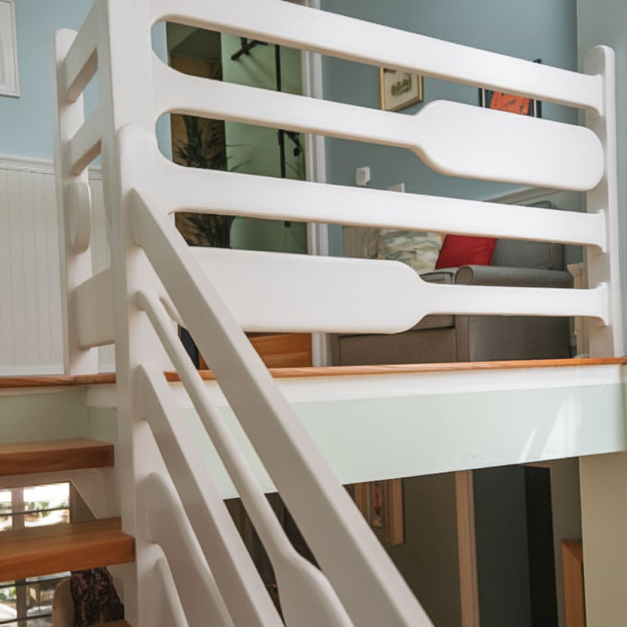 Another nature-inspired idea, this stair railing seems like the perfect match for a cabin situated on a lakeshore. It features oar-shaped balusters that make a solid combination with other coastal decorations in this home.
