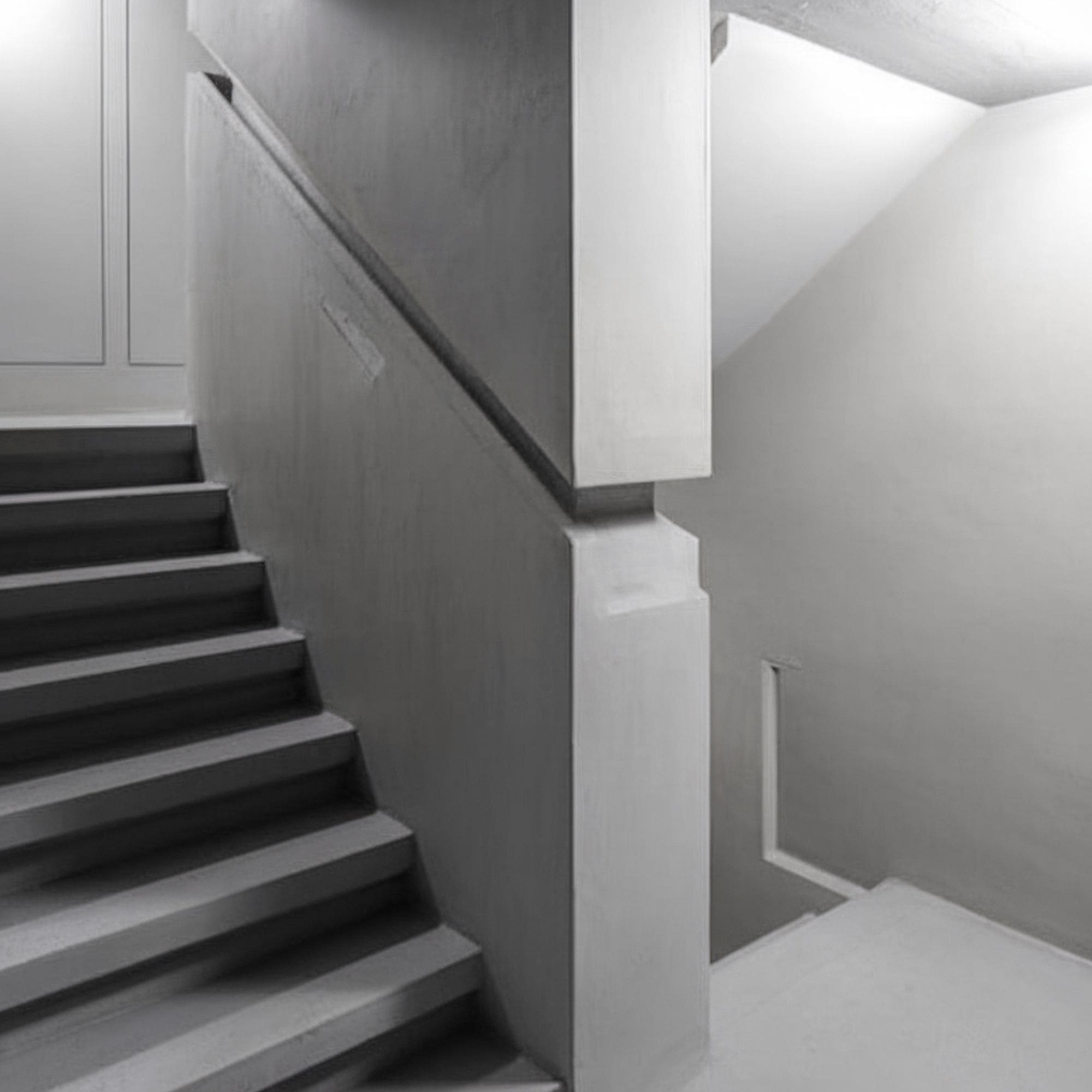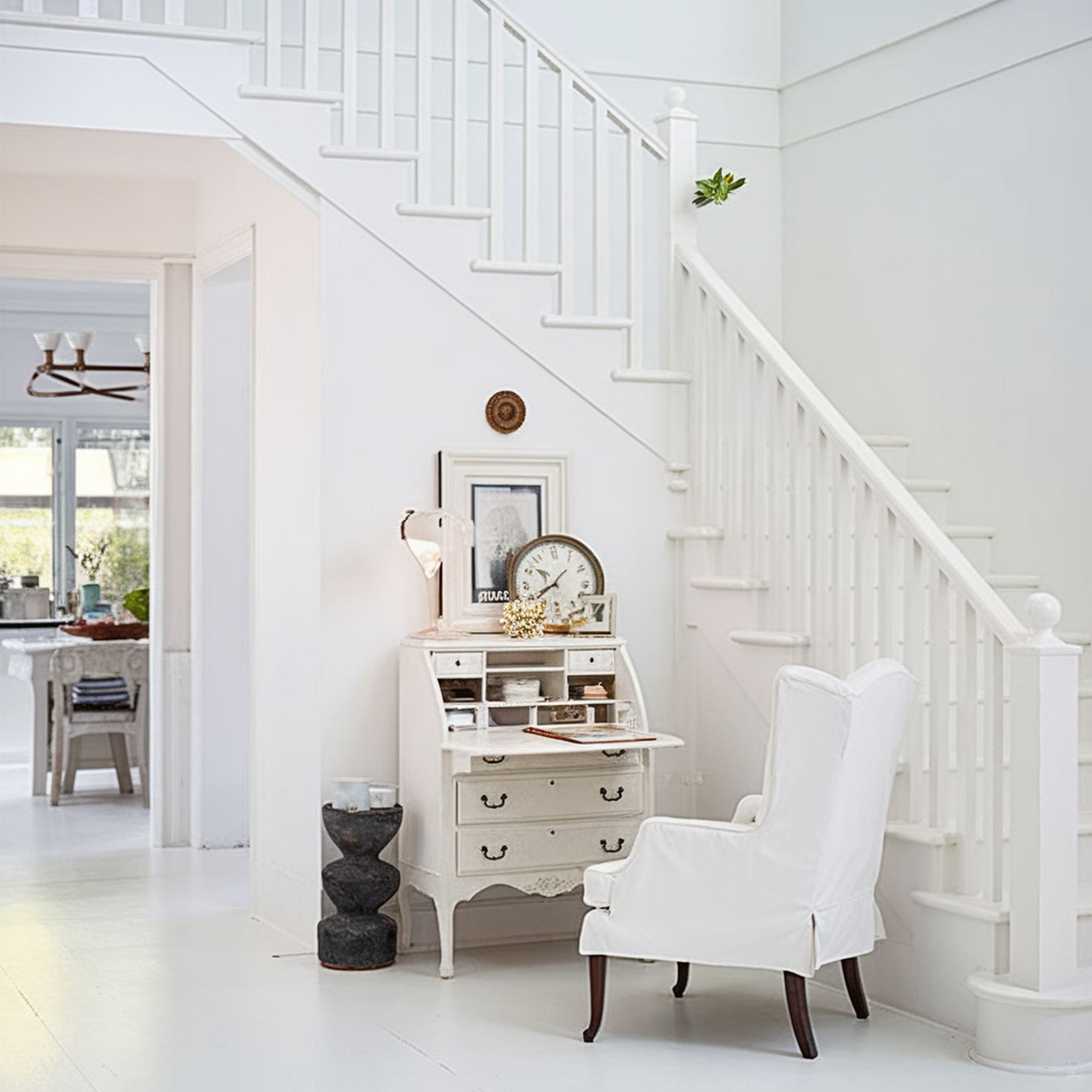 Instead of attracting unnecessary attention, this pure white stairway railing blends in beautifully together with the steps and walls. The result is a bright space that feels welcoming and minimalist through its monochromatic color palette.