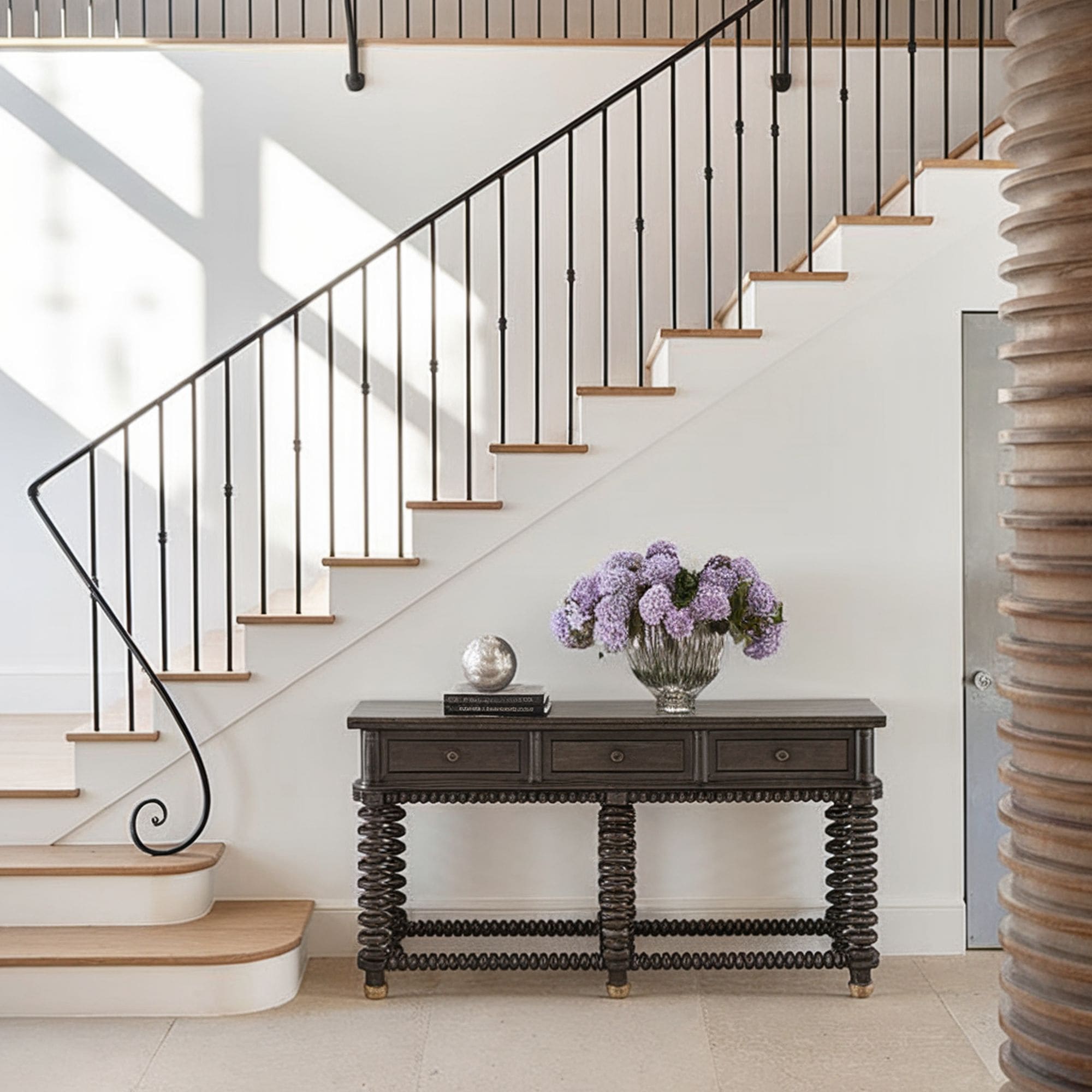 The iron railing brings only a subtle antique charm because of its linear design without intricate patterns. The balusters are kept straight with only minimal embellishments for a slight decorative touch. It’s a great choice considering the open and inviting style of this interior with sparse decorations. The stairway railing appears to follow the home’s airy rhythm.