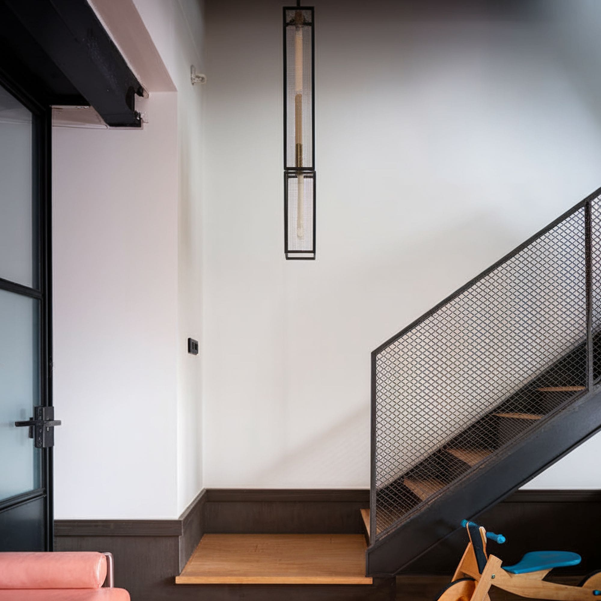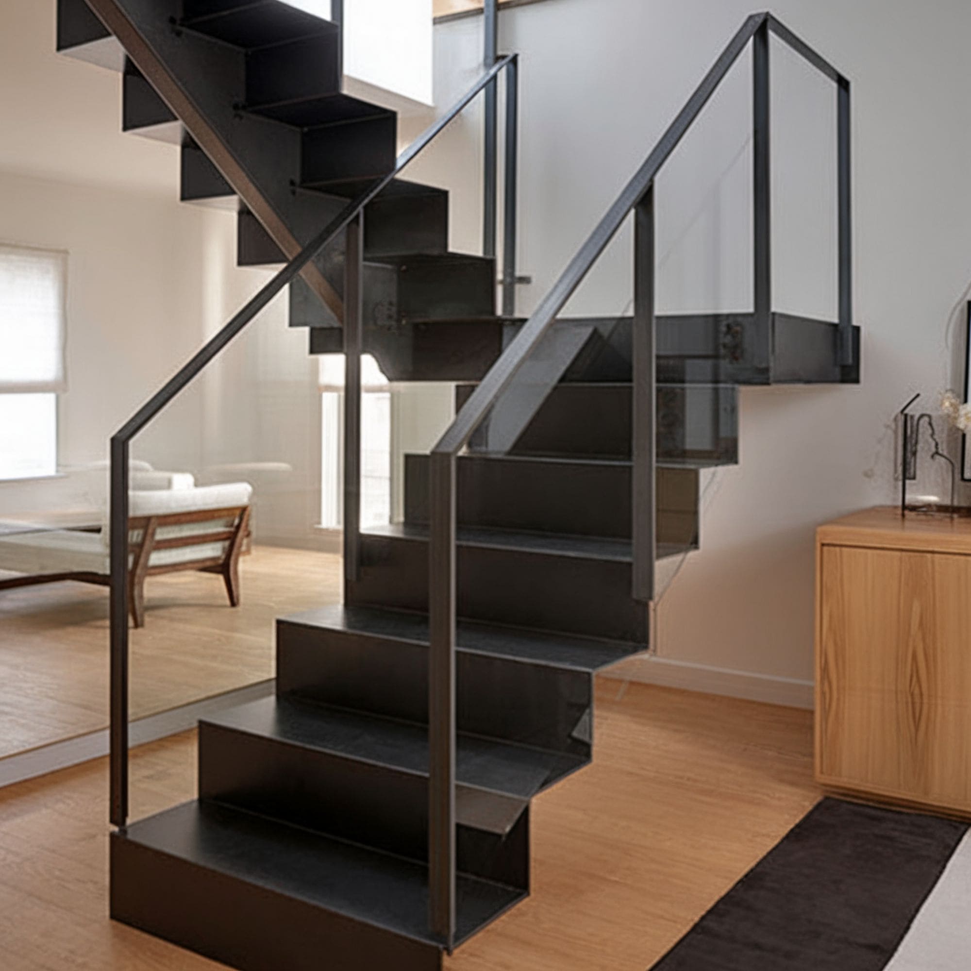 The spindles are arranged in a more unconventional configuration after being laser cut from rolled steel. This is an interesting idea to try if you’re looking to expand your aesthetic vision beyond the classic appearance of staircases with traditional spindles.