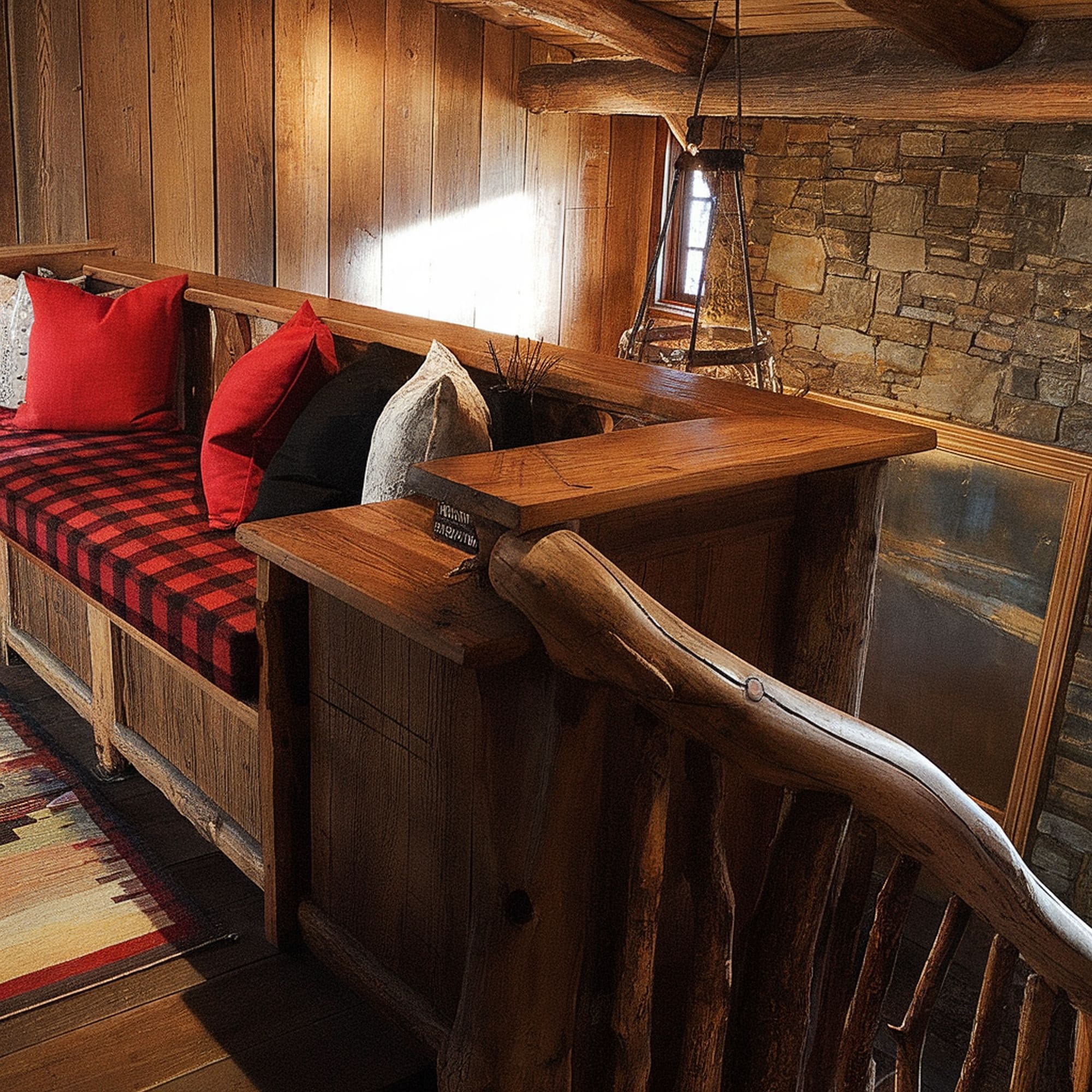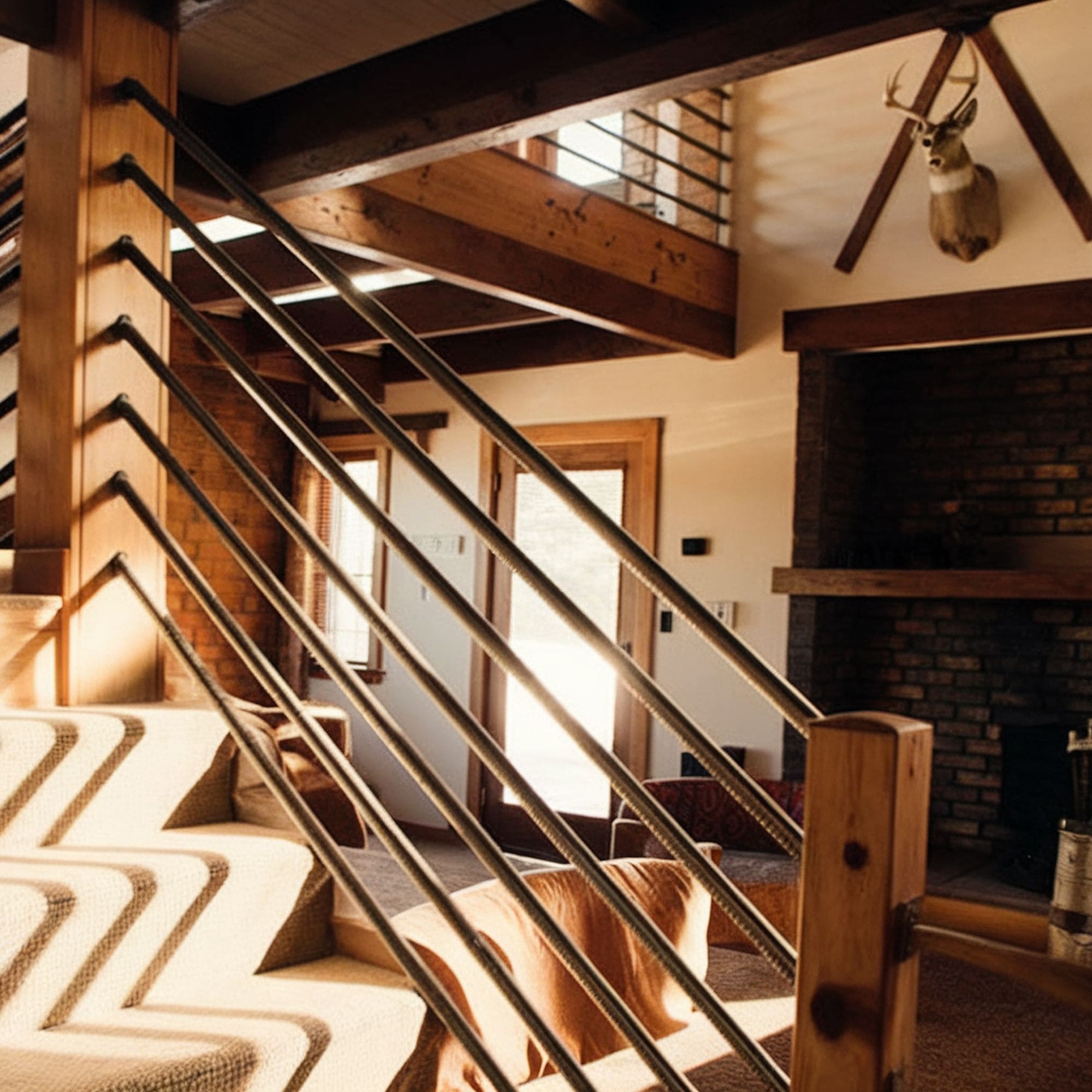 The coziness of the wooden stair railing is accentuated through other natural materials in the area as well as the traditional patterns used. It’s a very stylish approach if you want to increase the sense of warmth in the room and bring a sculptural feel whenever you’re using the staircase. This is a must-have design to incorporate in any rustic cabin aesthetic.