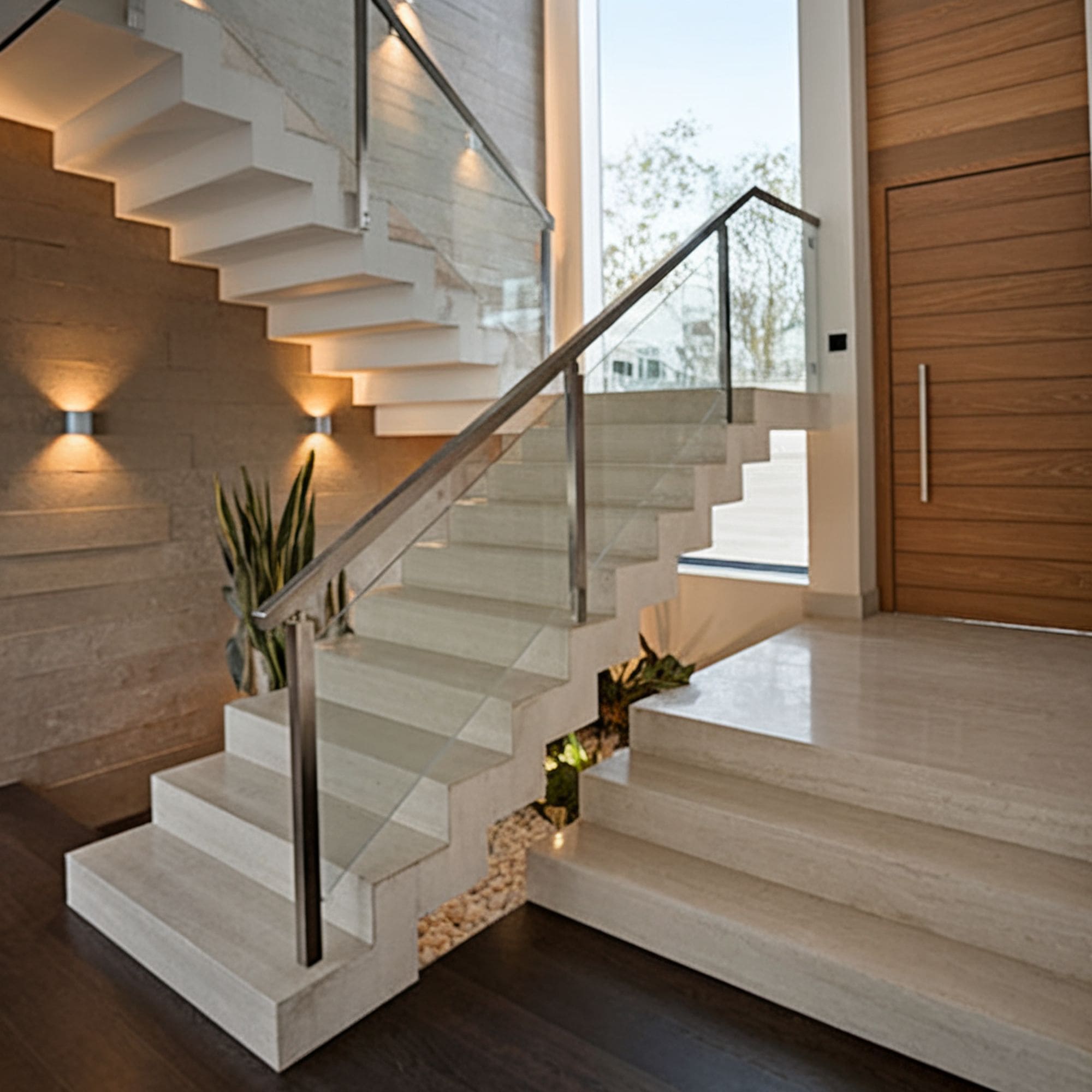 Providing a sturdy yet lightweight vibe at the same time is possible if you choose this kind of stair railing idea. It’s made using folded plate steel that appears to be floating when taking into account the absence of balusters.