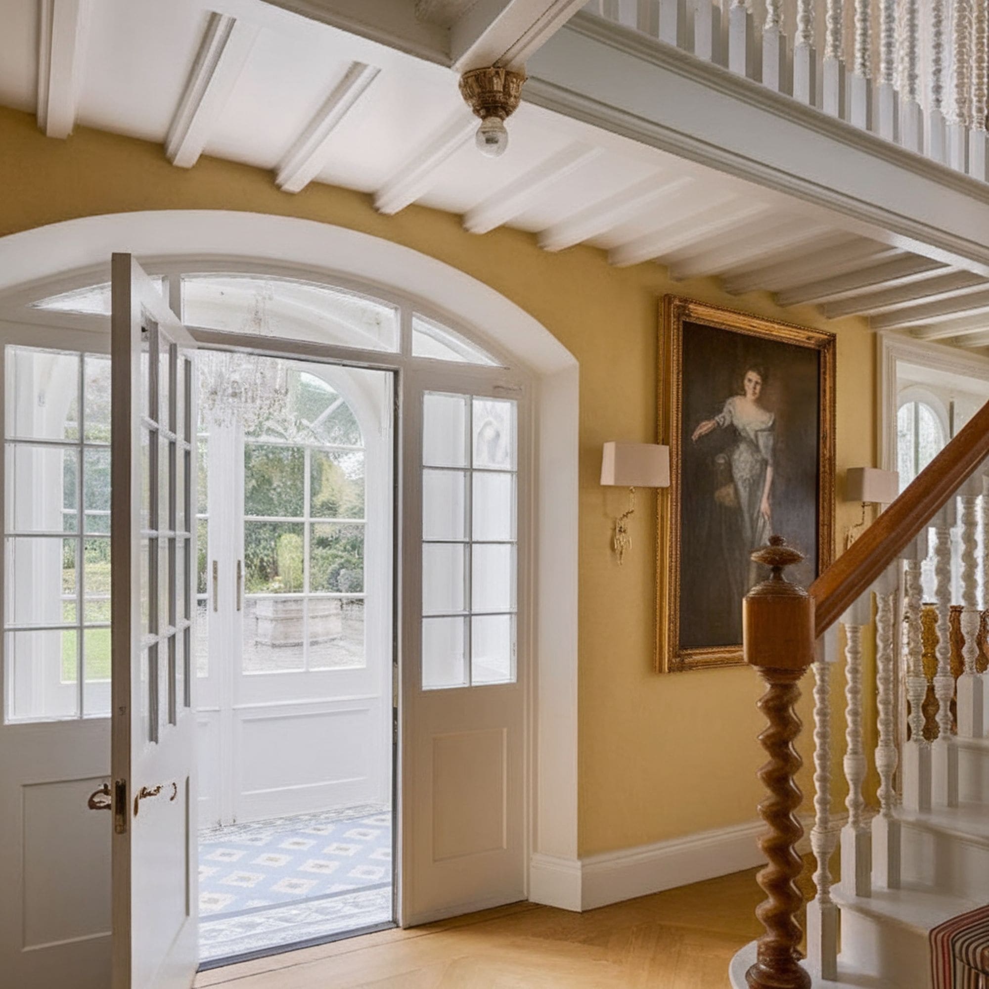 Despite the attractive visual effect, the railing design is airy enough to allow natural light and a clear view of the arched window behind the stairs. This idea is recommended if you want to put an artistic touch to the stairway without compromising on its traditional design core.