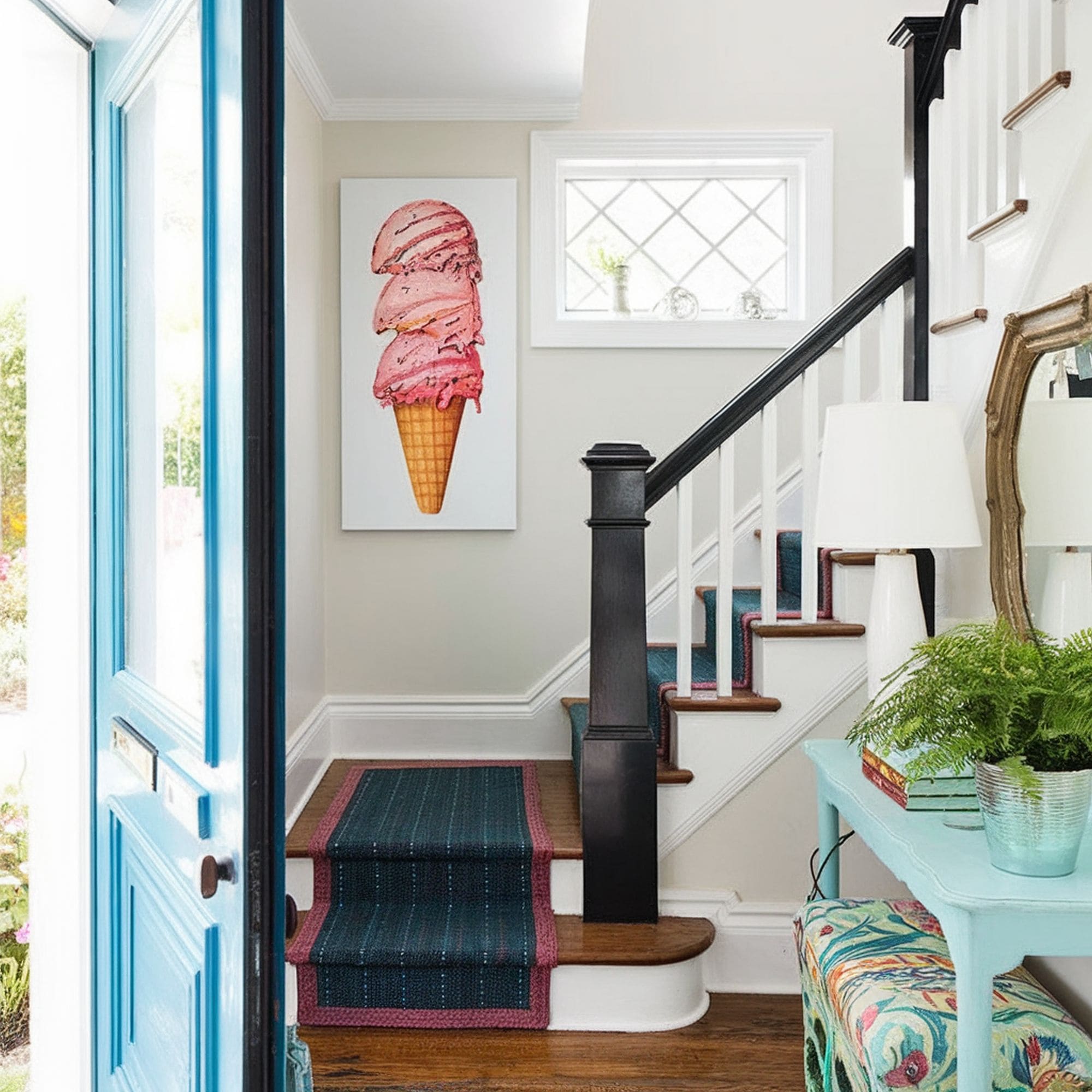 While the balusters and risers are painted white here, the newel posts stand out more boldly thanks to the use of black paint. The result is a fresh appearance with minimal effort. Just make sure you coordinate the colors with the rest of the structural elements of the staircase for a truly harmonious look. Using flashy colors to paint the railing can be too much of a commitment for some homeowners. That’s why you can bring a splash of color more easily through a stylish staircase runner.