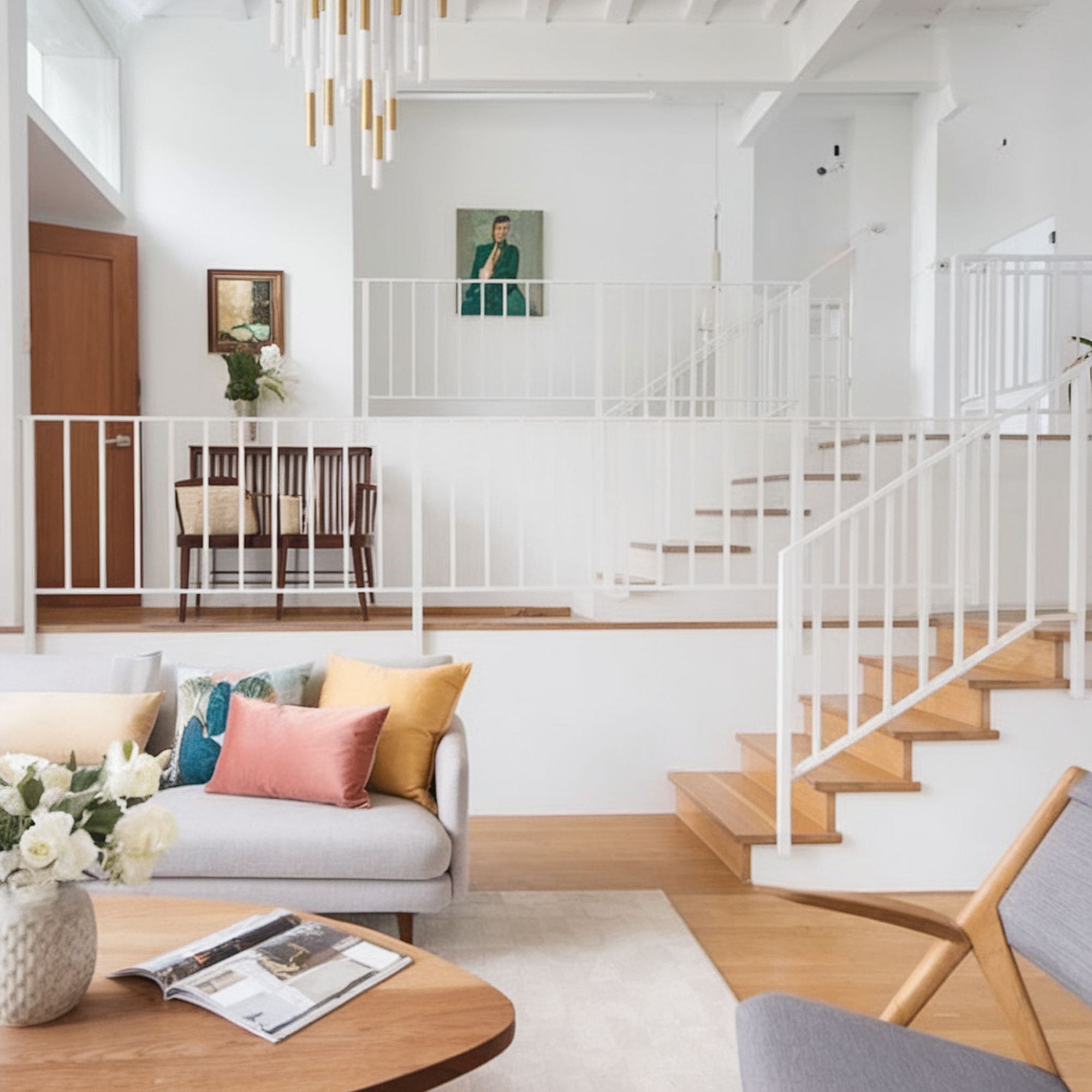 Those who prefer the idea of bright and airy stairs should try this design approach involving minimalistic white railings. The slender style of the pristine railing lines makes a superb visual impression in this living room.