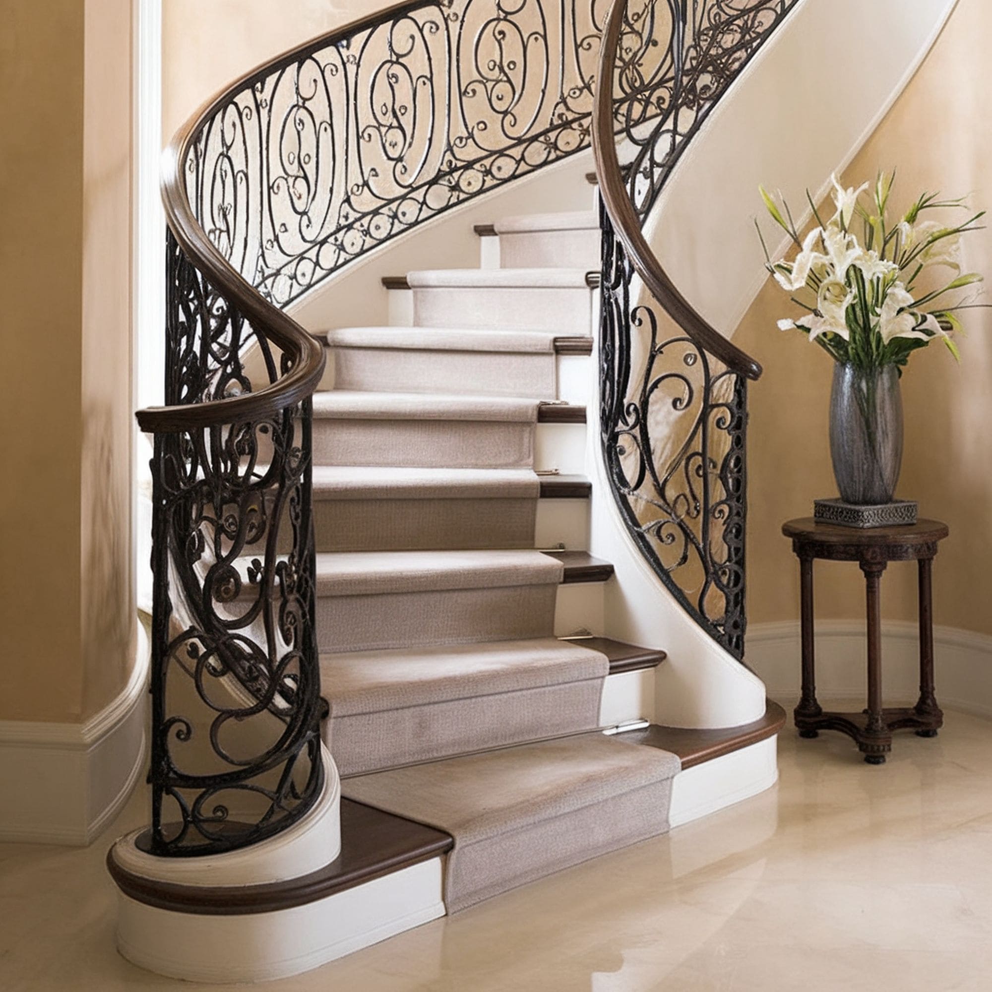 Emphasizing the shape of the stair railing can be a smart solution for enhancing the visual appeal of any staircase. Check out the sinuous curves created by the railings here. They bring a unique visual identity to match the elegant style of these stairs.