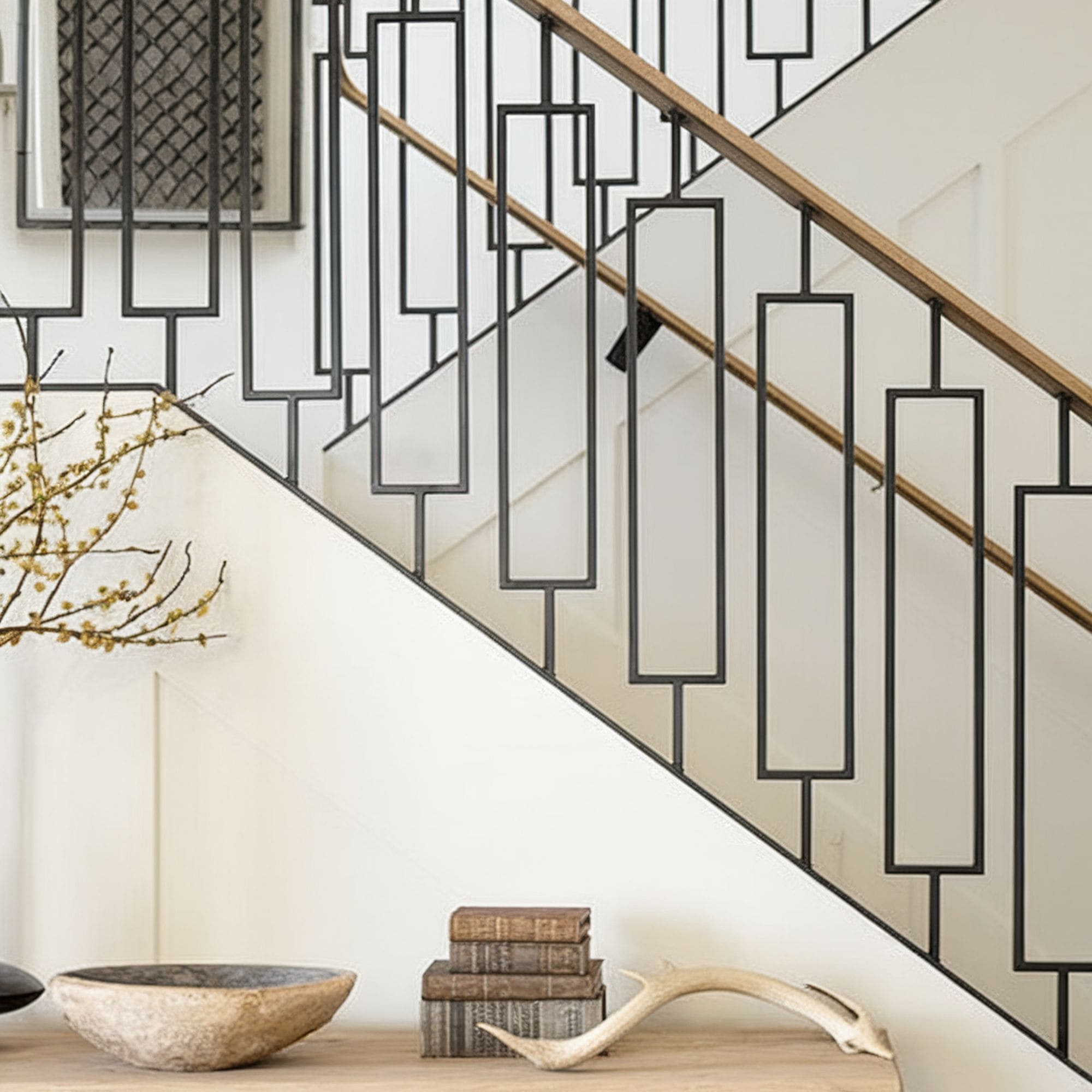 Mesmerizing and elegant, the geometric look of these stair railings will add a great decorative effect to any modern home. There’s something about the symmetrical appearance of these rectangular shapes that creates a solid impression of balance for the entire staircase.