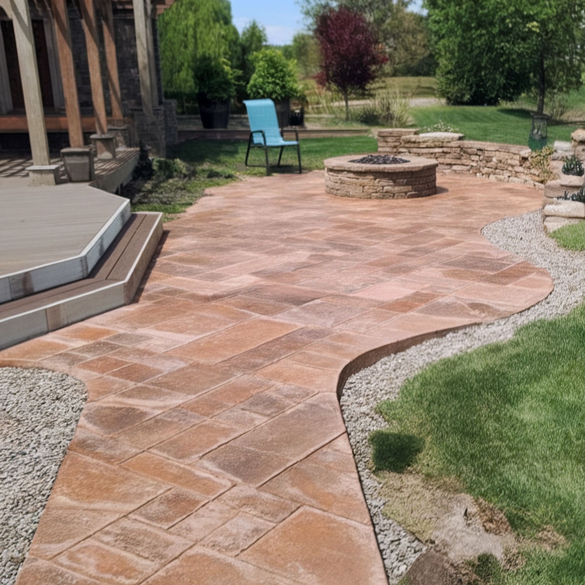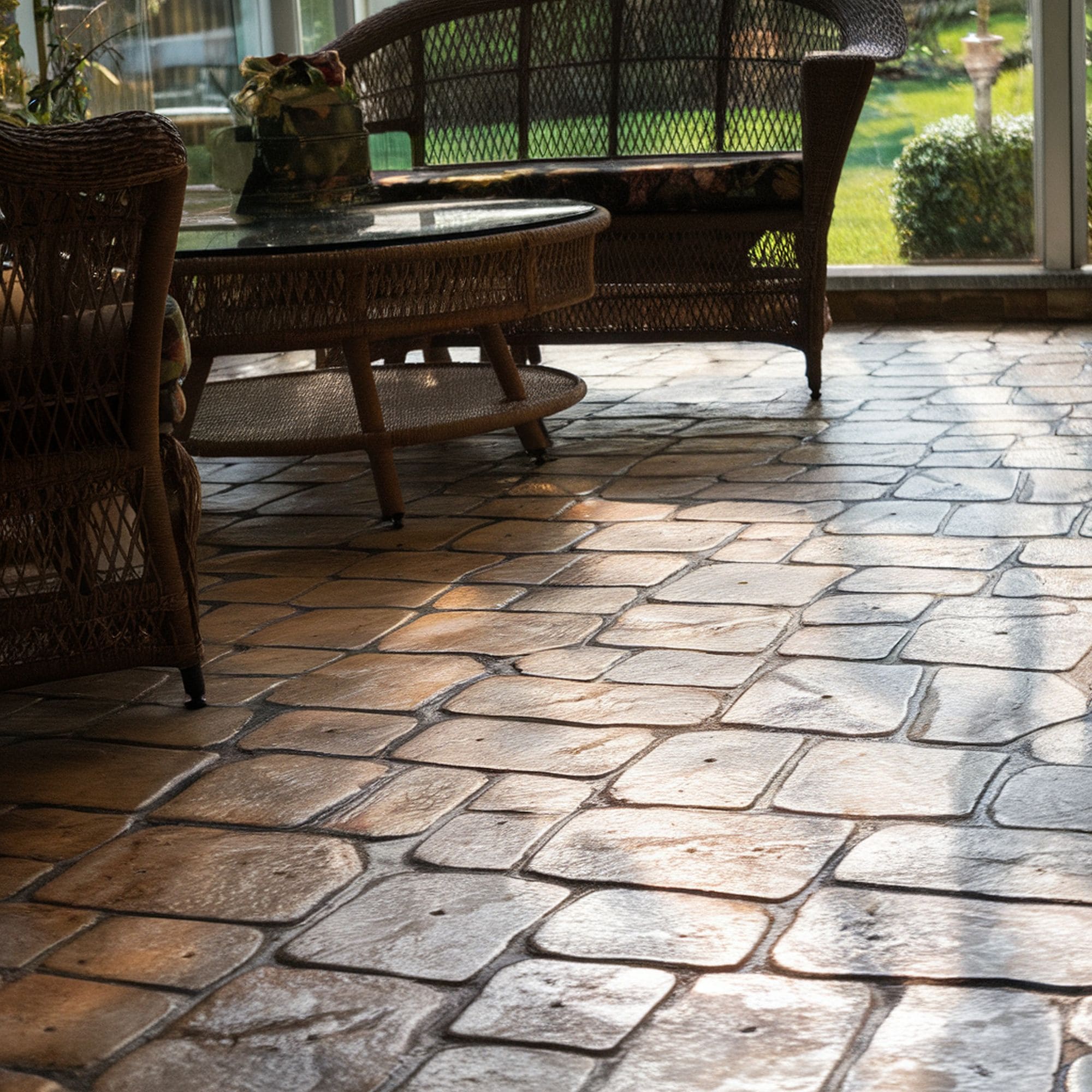 Beautiful cobblestone designs take a bit of creativity to shine. It’s recommended to opt for even square imprints if you prefer a more traditional appearance. Circular patterns work better if you want something more eye-catching. For the most intense historic vibe, it’s worth trying out rougher patterns with more irregular styles and deep stone impressions at the cost of making patio mobility more challenging.