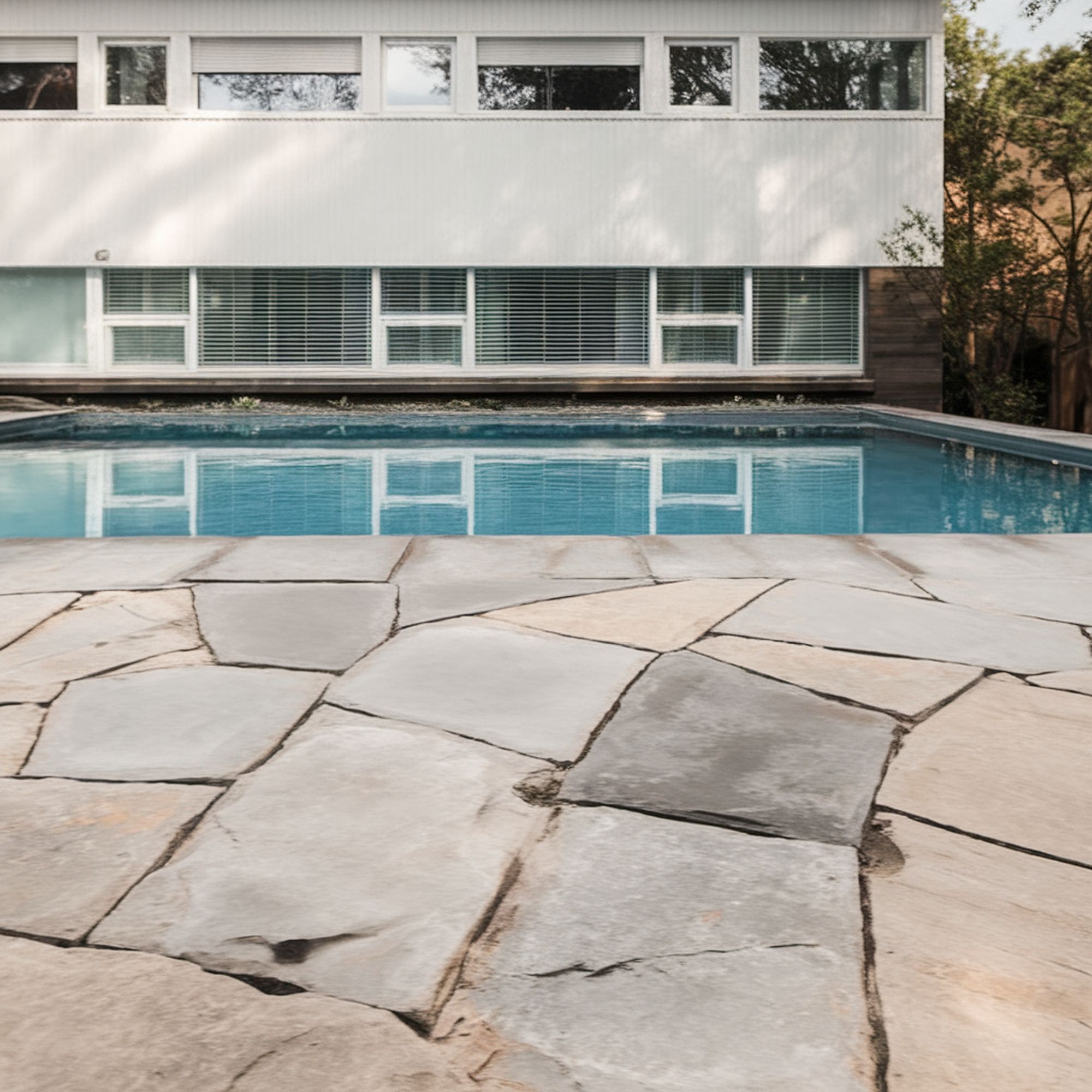 Stamped concrete offers a lot of freedom to create distinctive patterns. The Mid-century appearance of this house is enhanced by the textured concrete patio that simulates pavers placed in chaotic patterns. It seems like a great visual match for the swimming pool as well.