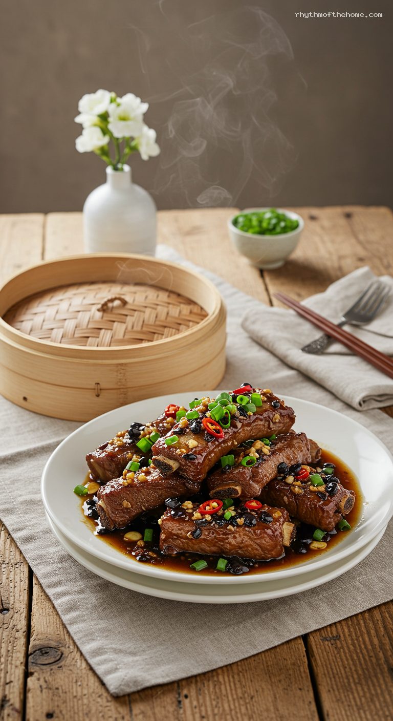 Turn off the heat and let the ribs rest covered for 2 minutes to settle the juices. Carefully remove the plate (watch for hot steam), sprinkle generously with sliced scallions, and add extra chili if desired. Serve immediately, spooning the savory black bean–garlic sauce over each portion. Wonderful with steamed rice or congee.