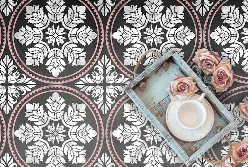 Floral patterns won’t go out of style anytime soon. They’re highly recommended for making detailed stenciled concrete floor designs. The complexity of the design contributes to hiding the imperfections of the floor more effectively. If this kind of stencil feels intimidating to pull off, consider opting for large-scale options that are quicker to apply.