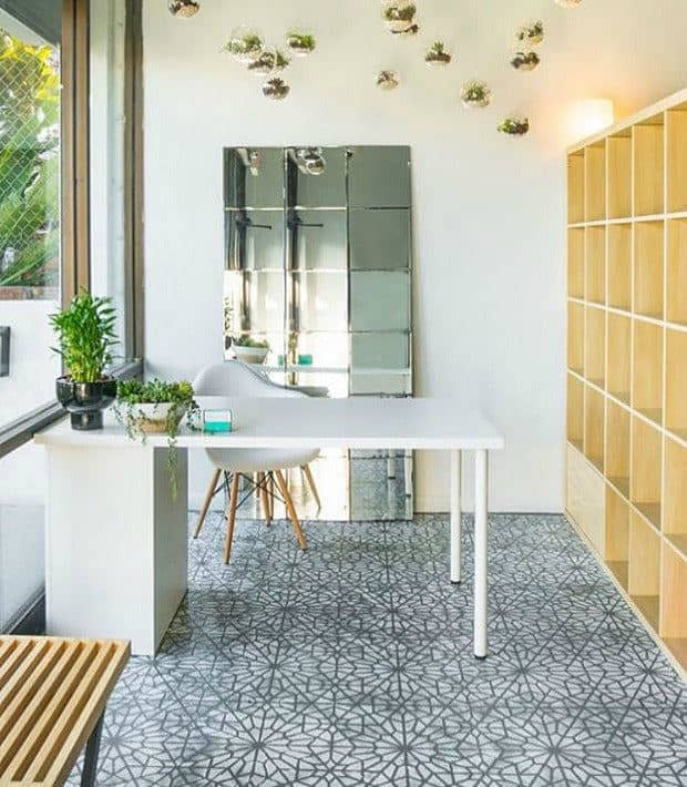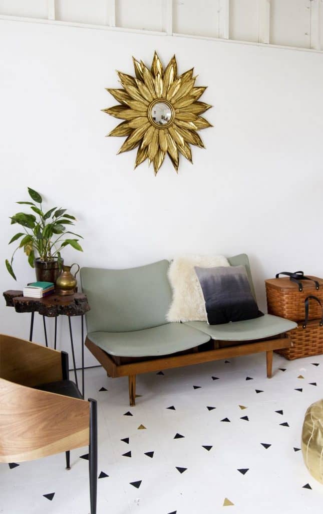 Updating the look of your concrete floor using stencils can usually take some considerable effort. Not all ideas need to be difficult and time-consuming though. Check out this simple stenciled concrete floor project that adds a lot of character to this stylish office studio. It’s based on fun geometric shapes stenciled randomly on the floor. They create an eye-catching look but the stencil design is subtle enough to avoid clashing with other patterns in the room.