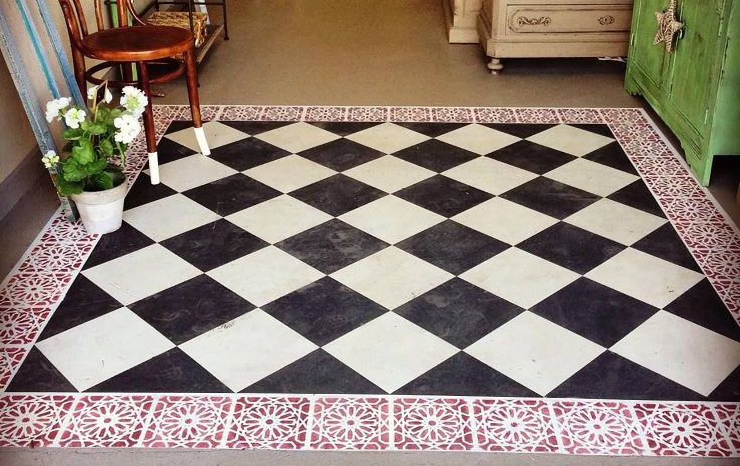 Instead of installing a tile floor, you can try out a stenciled concrete design that successfully replicates the look. The addition of extra patterns on the border helps to emphasize the black-and-white tile stencil even more. This idea is similar to the one that resembles the look of an area rug.