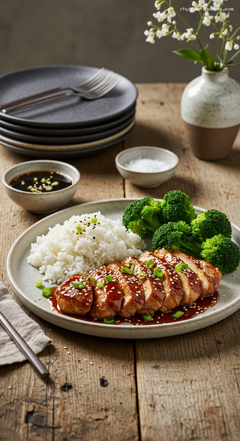 Refrigerate leftovers in an airtight container for up to 4 days. Reheat gently in a covered skillet with a splash of water until warmed through. The teriyaki sauce can be mixed up to 1 week in advance and stored chilled. Cooked rice keeps 3–4 days refrigerated; reheat covered with a sprinkle of water. The cooked chicken (sliced and glazed) freezes well for up to 2 months; thaw overnight in the refrigerator and rewarm gently.