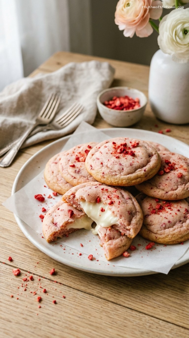 - Lemon-strawberry cheesecake cookies: Add 1–2 tsp finely grated lemon zest to the cookie dough and increase lemon juice in the filling to 1 1/2 tsp for a brighter, citrusy profile.