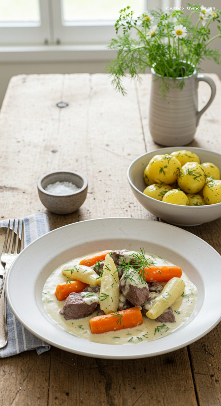 - Classic Swedish comfort: tender meat in a pale, velvety dill-and-vinegar sauce that’s bright, savory, and soothing.