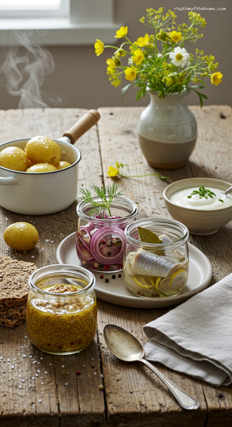 - Pantry: Salt-cured herring fillets, distilled white vinegar (12% preferred), granulated sugar, neutral oil, Swedish sweet mustard, Dijon mustard, whole allspice, white peppercorns, bay leaves, mustard seeds, crispbread (knäckebröd), kosher salt