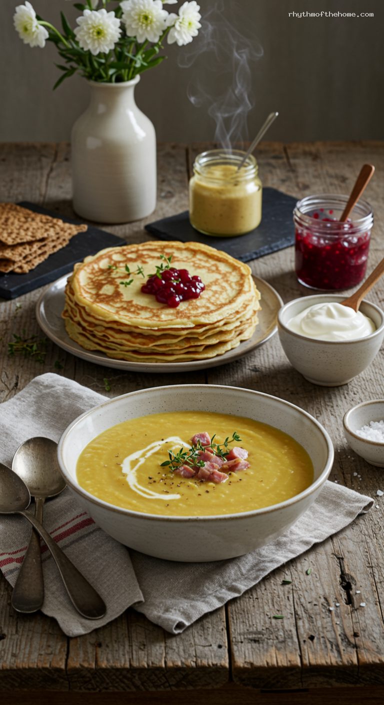 Ladle the soup into warm bowls and offer extra Swedish mustard at the table. Plate 2 pancakes per person with spoonfuls of lingonberry or strawberry jam and a generous dollop of whipped cream. Eat the soup first, then pancakes for dessert—just like a cozy Swedish Thursday.