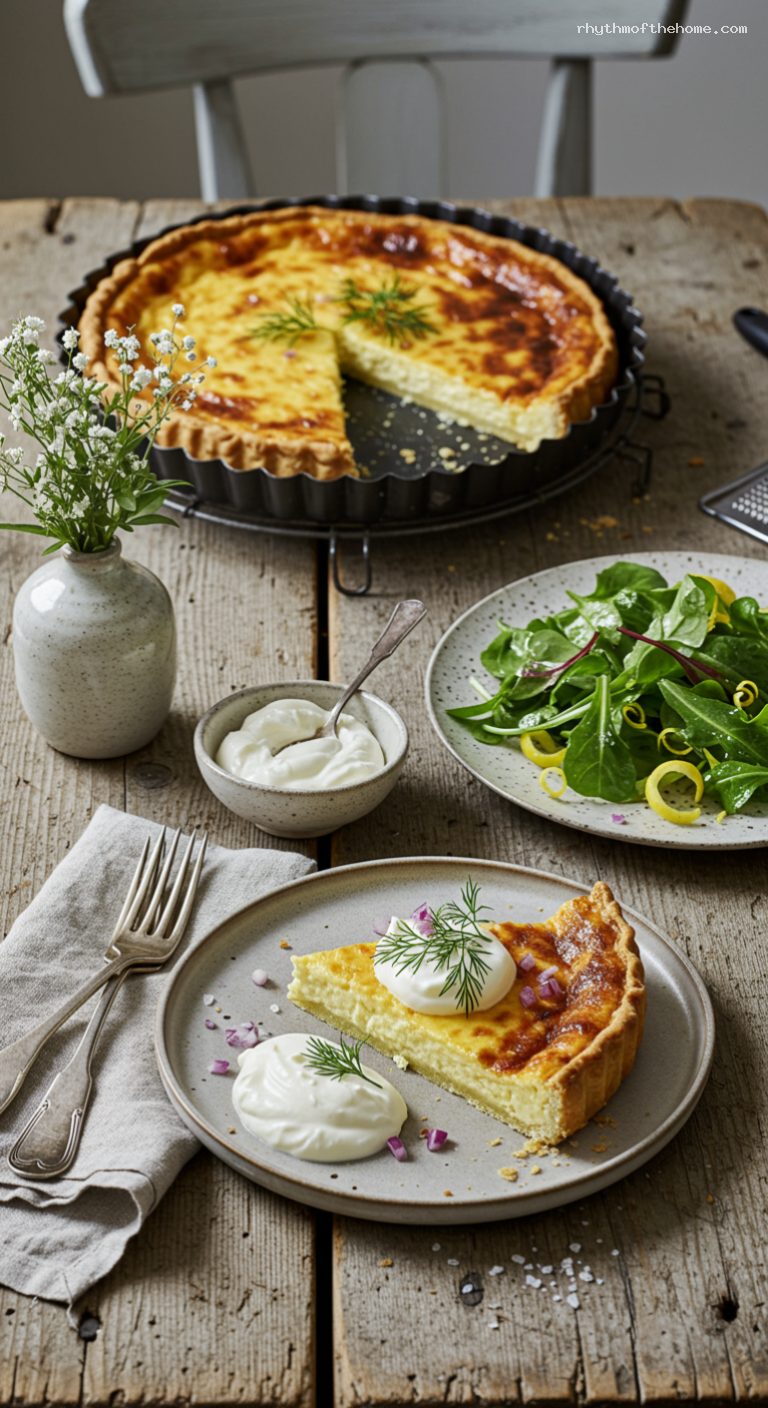 Cool the tart on a rack for 10–15 minutes to set. Meanwhile, soak the minced red onion in cold water or a splash of red wine vinegar for 5 minutes, then drain and pat dry. Cut the tart into wedges and top each with a generous spoonful of crème fraîche, a sprinkle of red onion, and dill or chives.