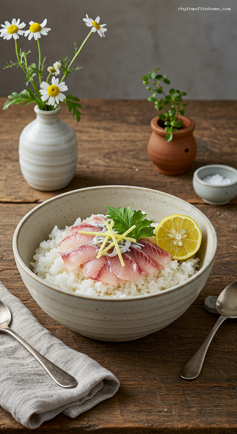• Mushroom tai-meshi: Add 150 g sliced shimeji or shiitake on top of the rice with the ginger (no other changes).