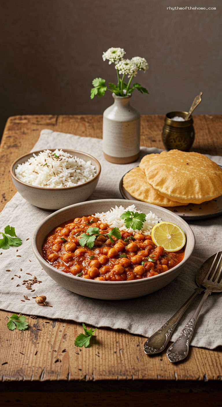 Chana masala keeps refrigerated up to 4 days or frozen up to 3 months. Cool completely before storing; reheat gently on the stovetop with a splash of water. Jeera rice is best fresh but can be refrigerated 2 days; reheat covered with a sprinkle of water. Puri is best right after frying; to make ahead, roll the discs, stack with parchment, and fry just before serving.