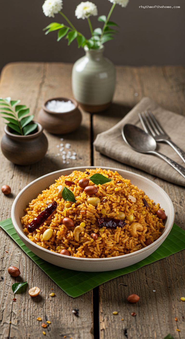 Serve warm or at room temperature with papad or yogurt on the side. For travel, cool to room temperature, pack in an airtight container, and keep out of direct heat. The natural acidity and oil help the rice stay fresh for several hours.