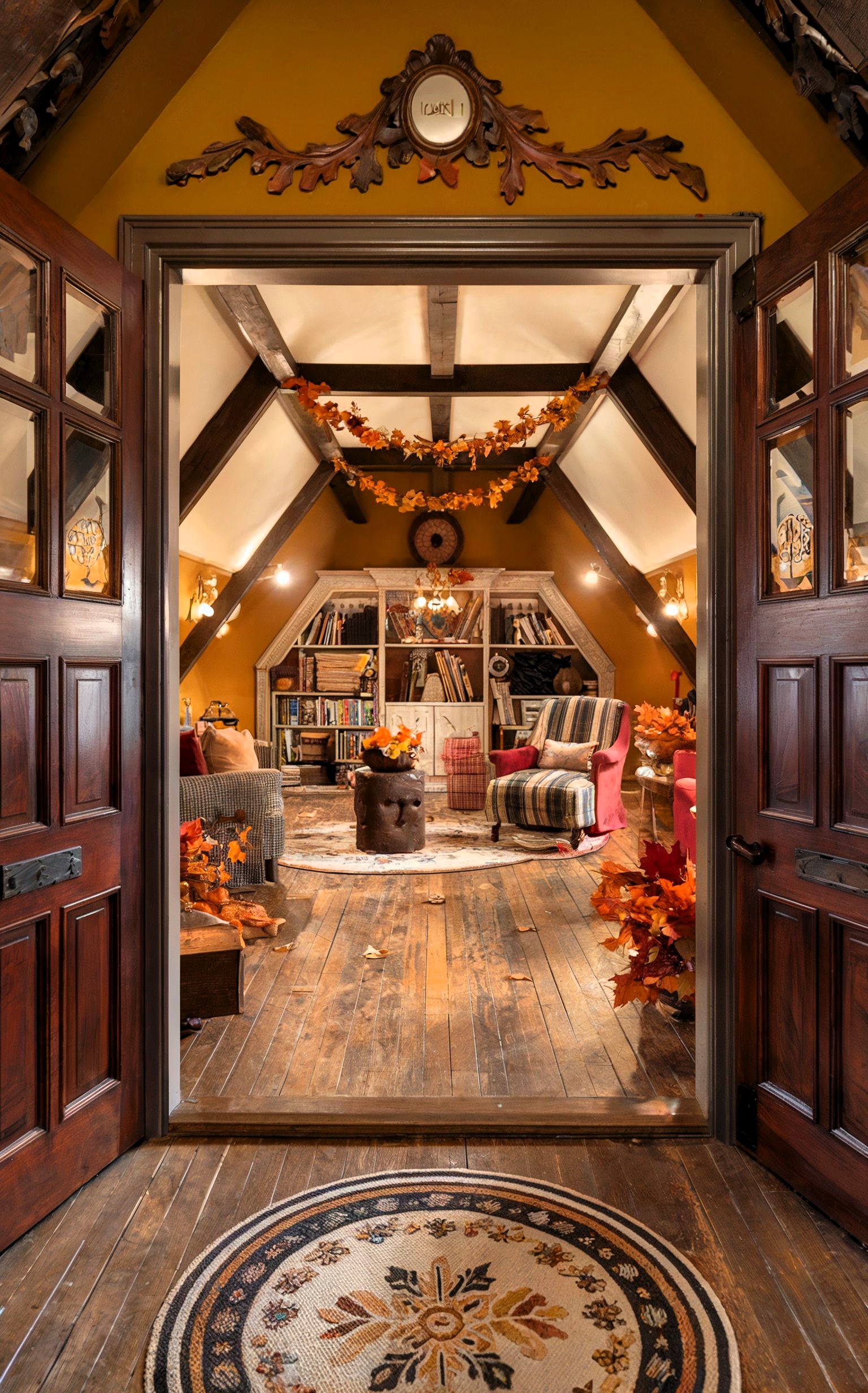 This opulent living room exudes old-world charm through its dramatic black architectural moldings and curved velvet sofa, while the layered vintage rugs in rich crimson tones create an inviting autumn tableau against dark-stained hardwood floors. The designer’s masterful mix of textures – from damask draperies to burnished metallic pumpkins – is heightened by the warm glow of candles and a roaring fire, while the classical limestone mantel adorned with cascading fall foliage serves as a stunning focal point that anchors this cozy yet sophisticated space.