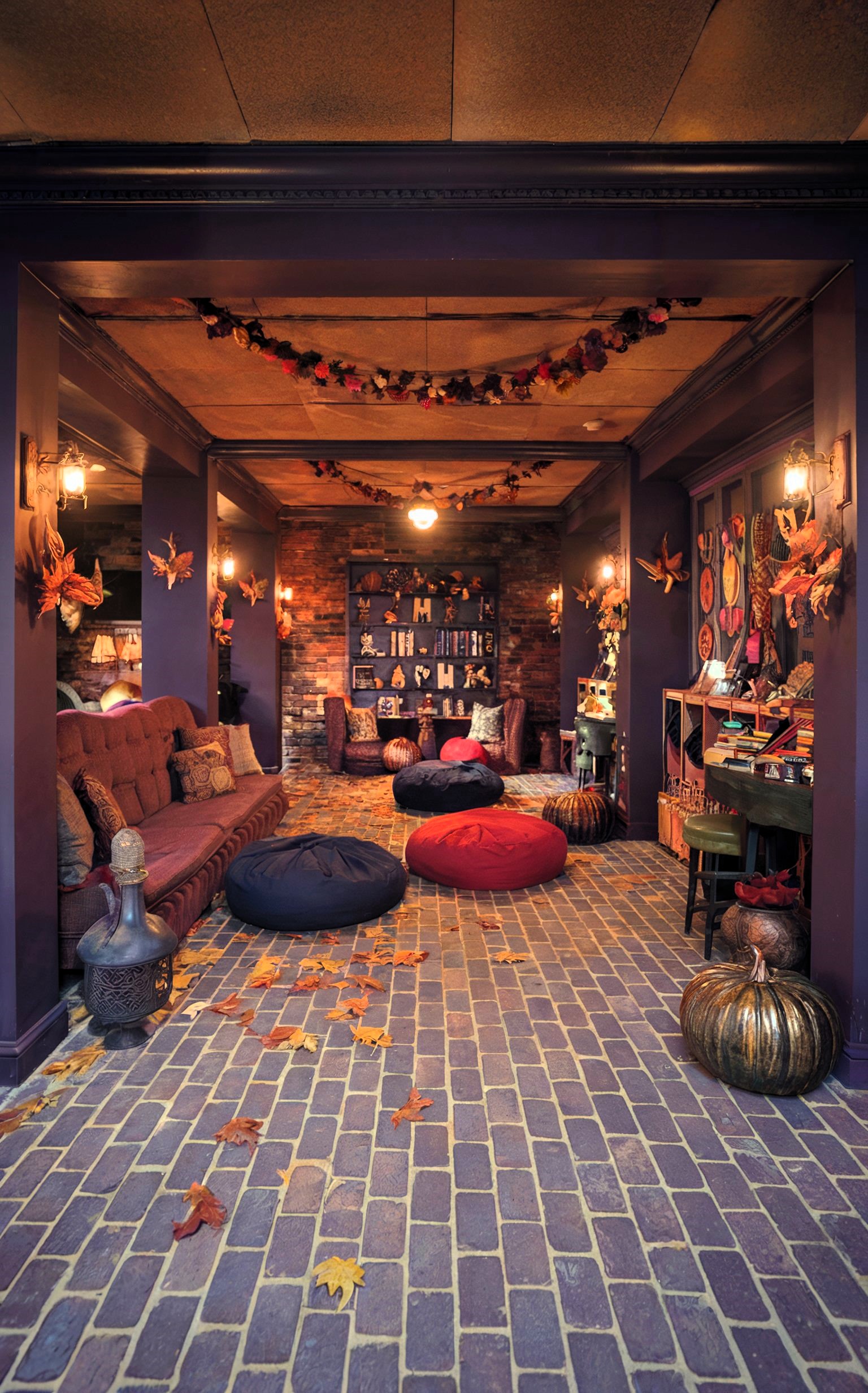 12. Purple Basement With Brick Flooring Decorated for Thanksgiving