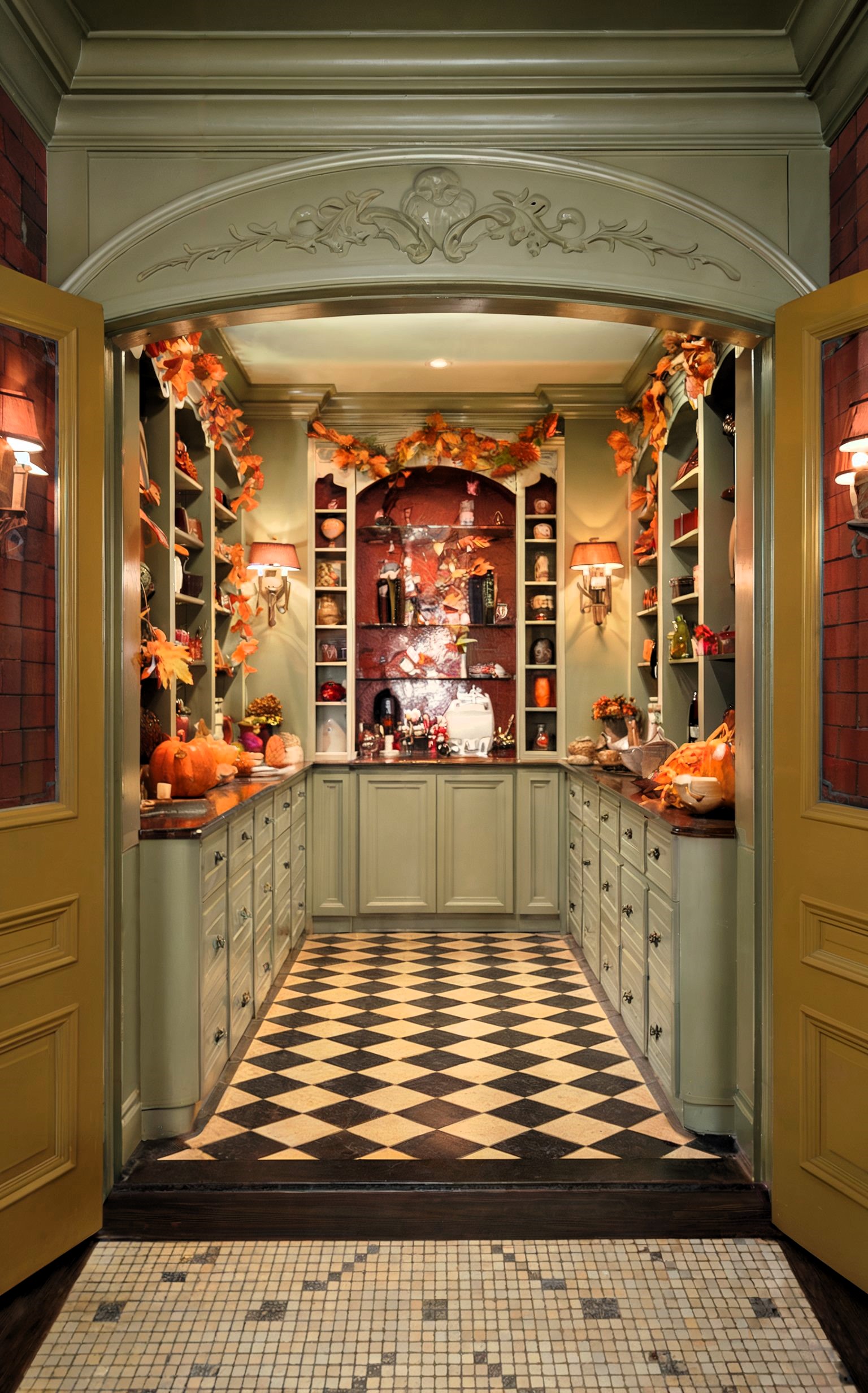 This charming butler’s pantry is brimming with autumnal warmth, featuring rich greens and pops of orange, while the black and white checkered floor adds a touch of classic elegance. The custom cabinetry and decorative accents create a sense of cozy luxury, making this space perfect for entertaining guests or simply enjoying a quiet moment with a cup of tea.