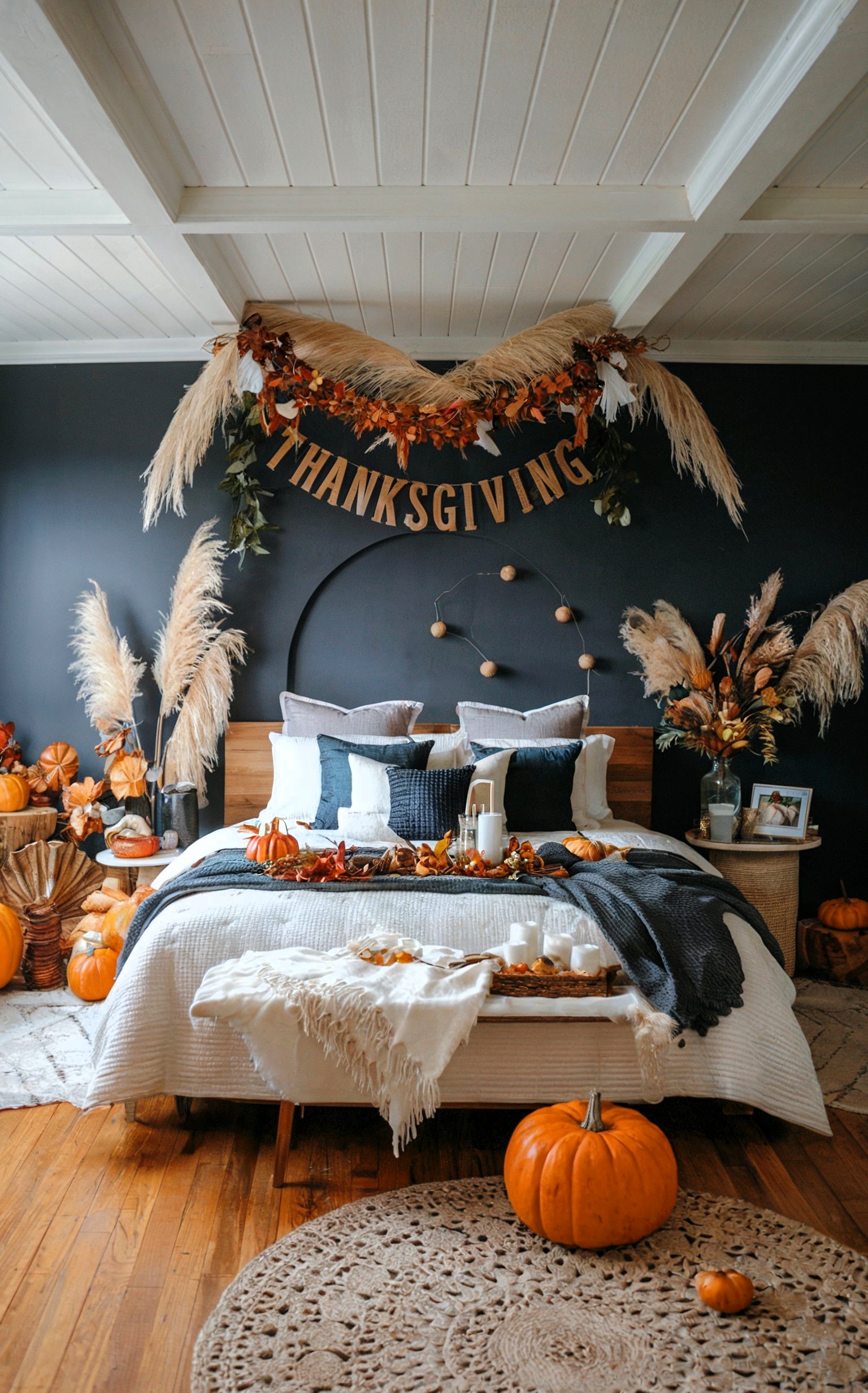 This sophisticated bedroom showcases a stunning autumnal aesthetic, featuring a moody charcoal accent wall adorned with a whimsical pampas grass and dried floral installation floating above a minimalist wooden bed frame. The designer has masterfully balanced textures through layered textiles in cream and navy, while incorporating seasonal elements like artfully placed pumpkins and a macramé rug, all unified under a planked white ceiling that adds architectural interest to the cozy harvest-themed retreat.