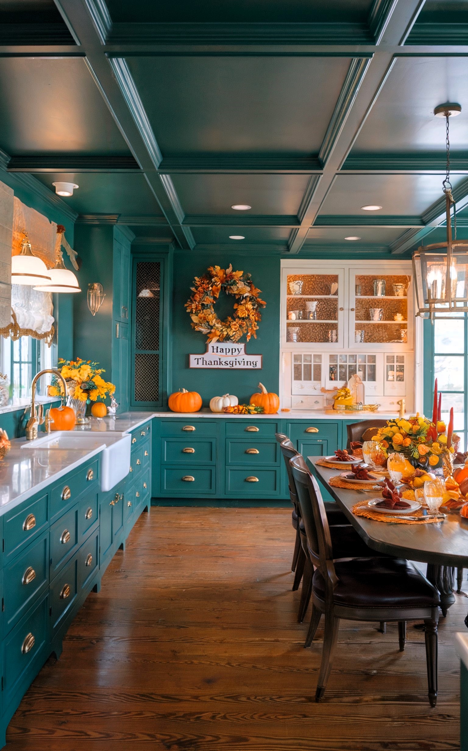 This bold kitchen makes a dramatic statement with its saturated teal cabinetry and coffered ceiling, beautifully offset by brass hardware and farmhouse sinks, while the vintage-inspired glass hutch adds architectural interest and display space. The harmonious blend of traditional and contemporary elements is enhanced by seasonal autumn décor, including vibrant orange pumpkins and florals that create a striking complementary color story, all grounded by rich hardwood flooring and punctuated with classic pendant lighting that illuminates the expertly styled Thanksgiving tablescape.