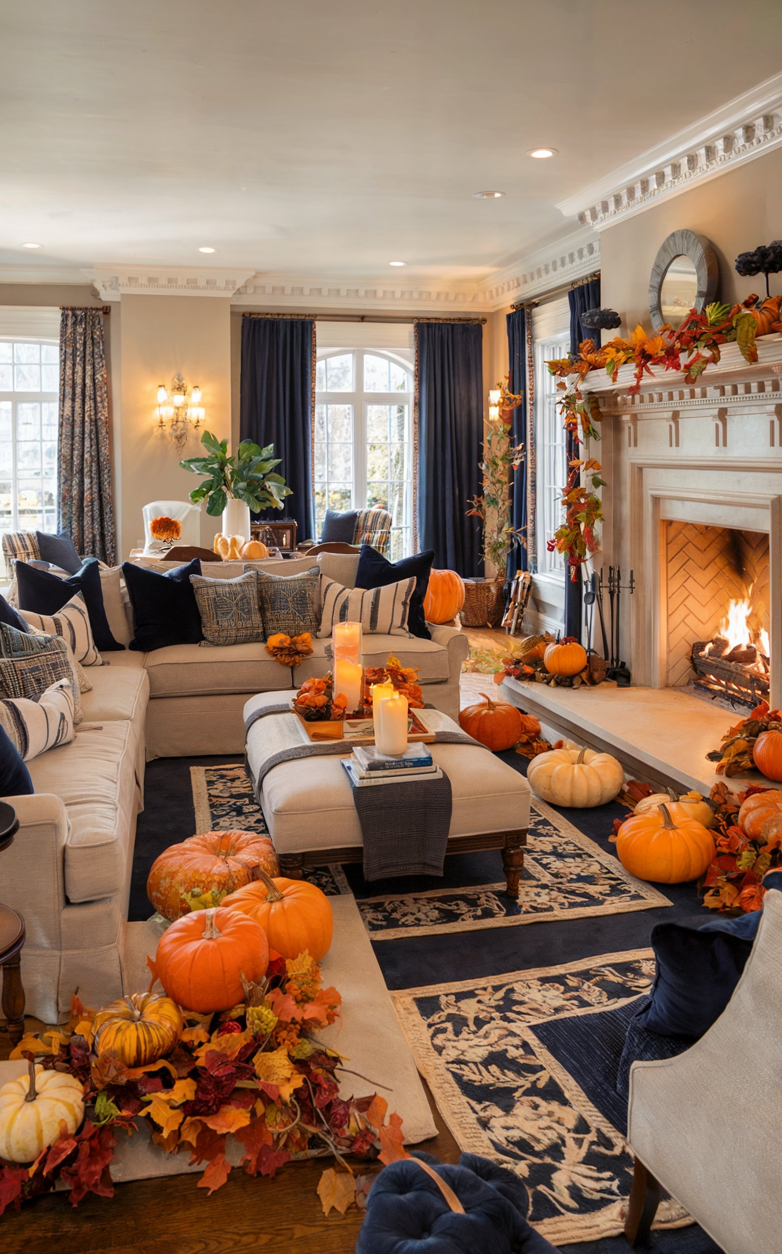 This luxurious living room exemplifies transitional elegance with its sophisticated neutral palette punctuated by rich navy accents, from the tailored drapery panels to the plush throw pillows, all anchored by a striking damask area rug and crowned with ornate dental molding. The space masterfully balances formal architecture, including a herringbone-detailed fireplace surround, with casual comfort through a generously proportioned slipcovered sectional, while seasonal touches of heirloom pumpkins and autumn foliage create an inviting harvest atmosphere enhanced by the warm glow of both candlelight and a crackling fire.