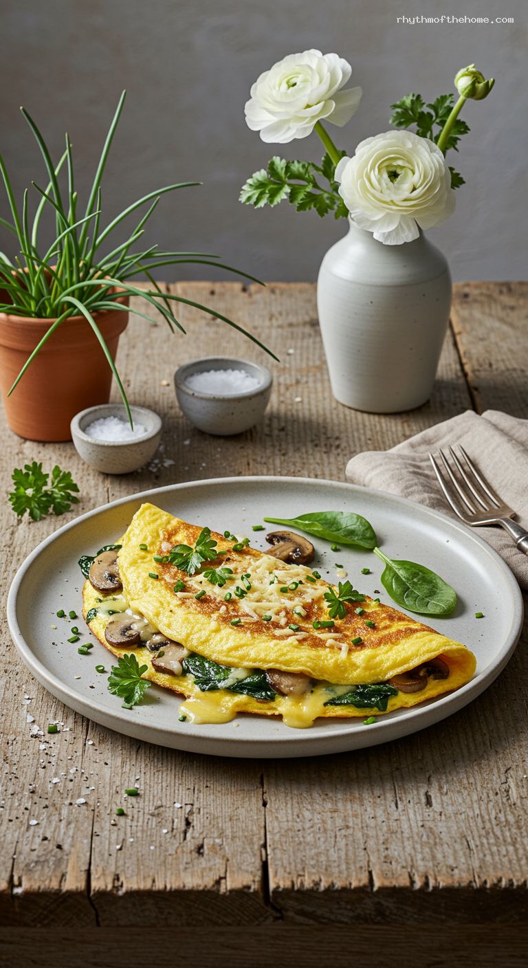 Sprinkle the Gruyère, cheddar, and Parmesan evenly over one half of the omelet. Spoon the warm mushroom–spinach mixture over the cheese. Cover the skillet with a lid (or a large plate) for 30–45 seconds to melt the cheese while keeping the eggs tender.