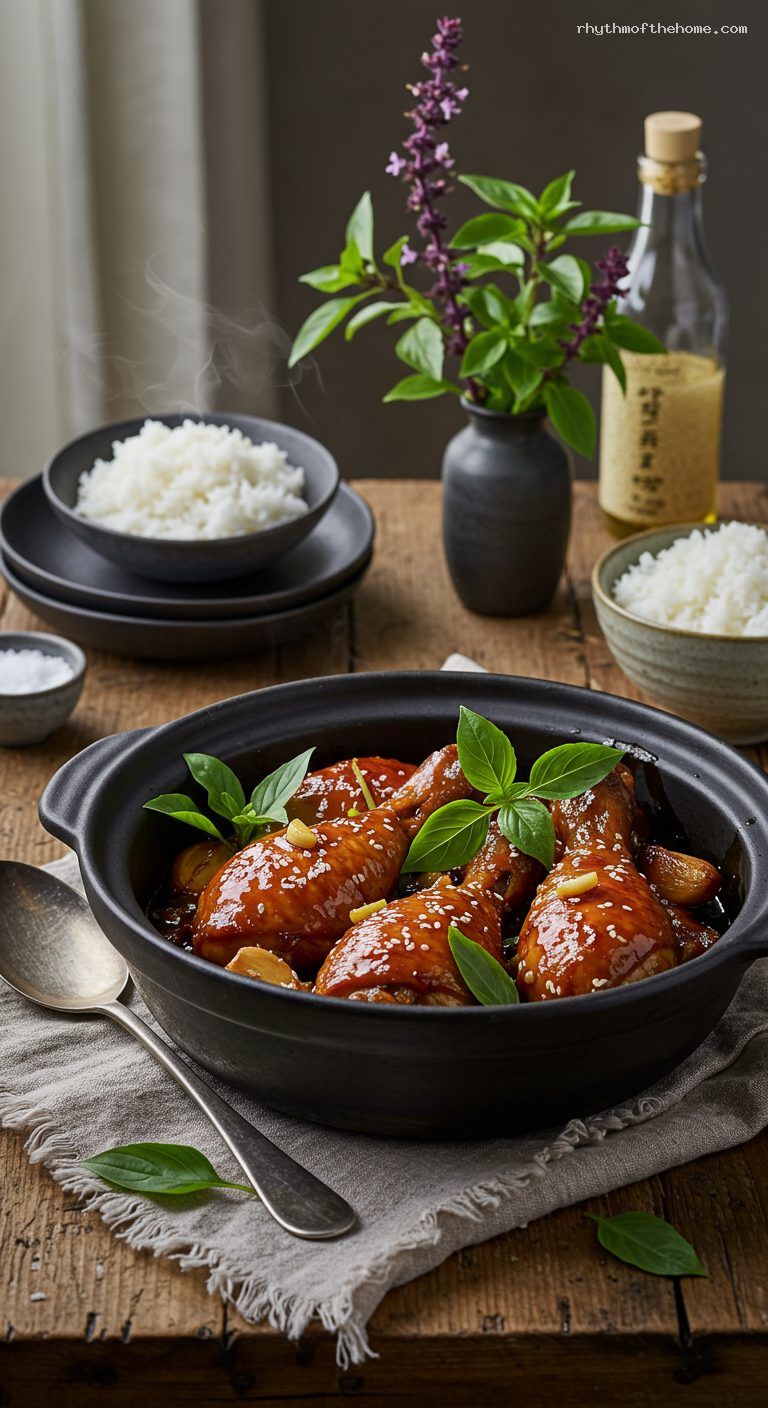 Pat the chicken pieces dry with paper towels so they sear well. Lightly smash the garlic cloves to help them release flavor. Slice the ginger into thin coins. Pick the Thai basil leaves from the stems and keep them ready in a bowl.
