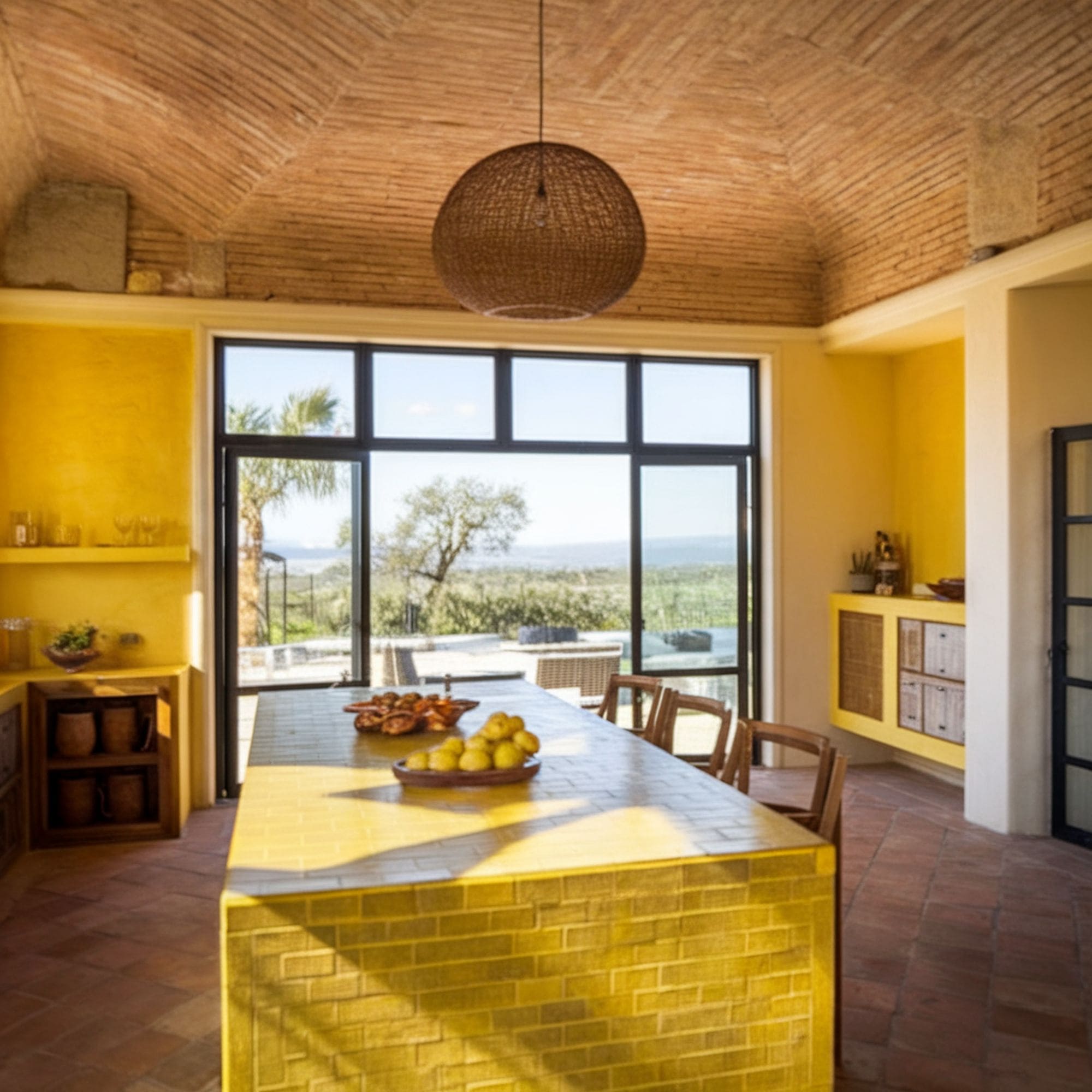 The bright yellow color scheme makes the perfect bold pairing with the prominent textures in this cooking area. The stunning kitchen island centerpiece together with all the other elements and accessories in the room can easily evoke Moroccan aesthetic vibes. Especially when you take into account the beauty of the handmade tiles.