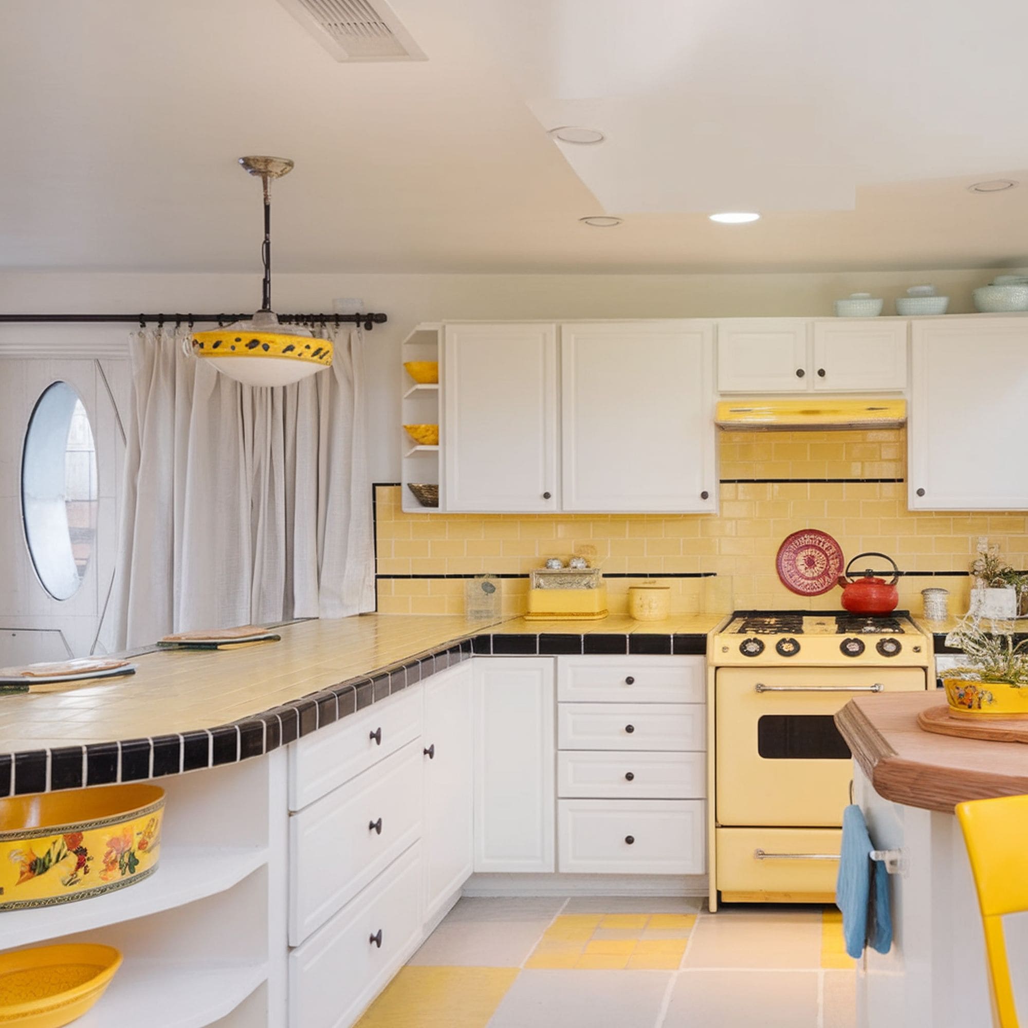 The mix of white and yellow appears to be a good option to balance out the overall aesthetic. There’s just enough fun provided through the checkered patterns on the floor and the glossy effect of the tile countertop that runs up to the cabinets for the backsplash as well. You might get the impression that all the items in this kitchen are old even though everything is brand new.