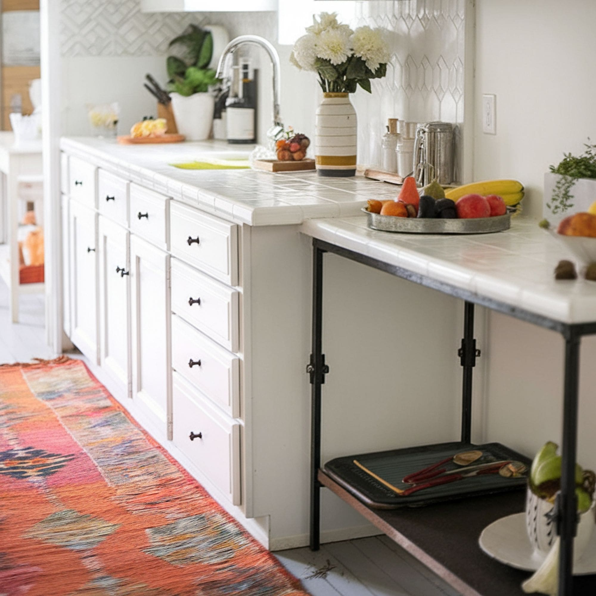 Tile countertops are fairly versatile and can be neatly integrated with a wide range of design styles. Vintage farmhouse aesthetics are always trendy when it comes to the look of the kitchen. A diamond-patterned tile countertop is a charming element that can be included alongside shaker-style cabinets and the antique faucet. With plenty of greenery and some utilitarian accessories like a cart, you can easily finish off your farmhouse cooking space.
