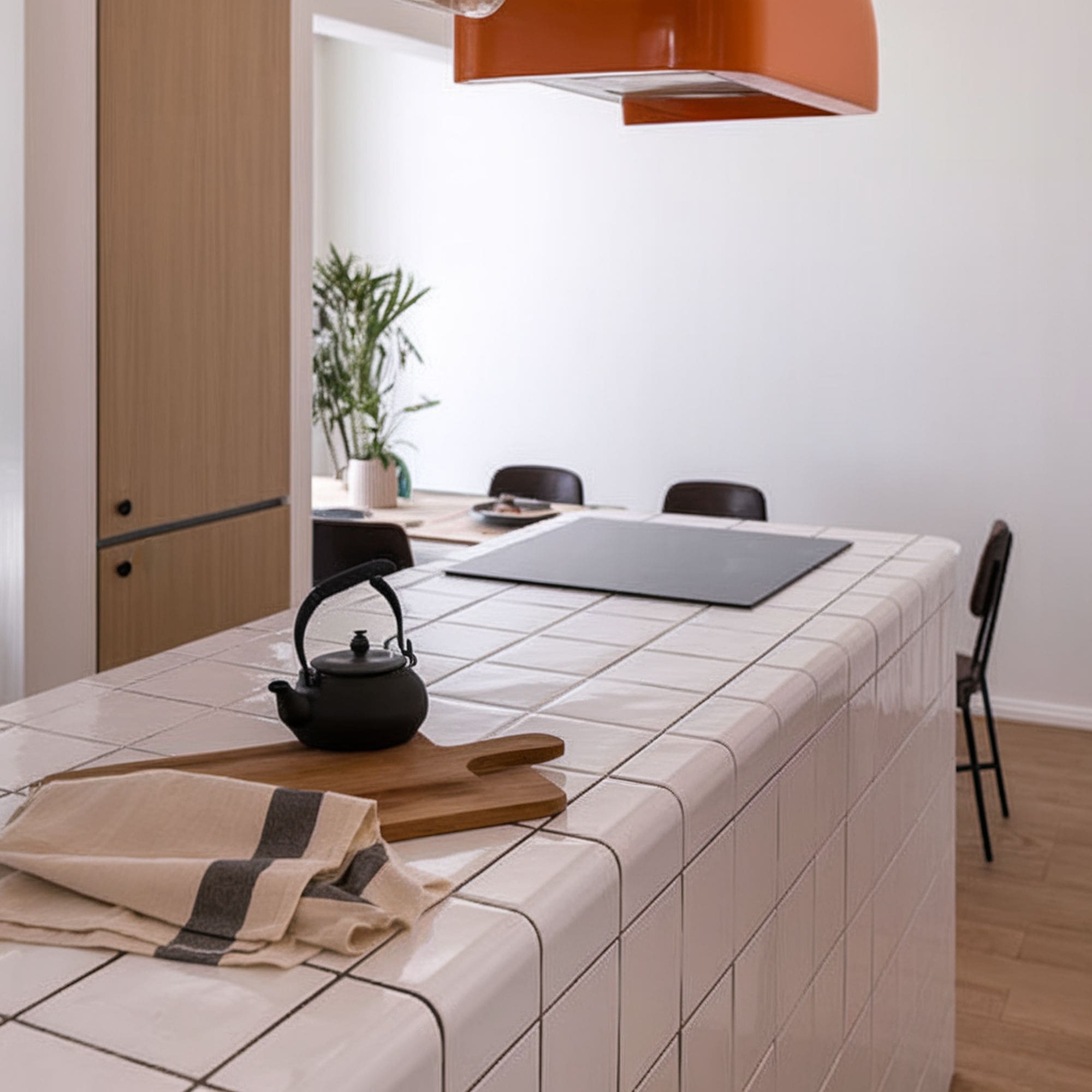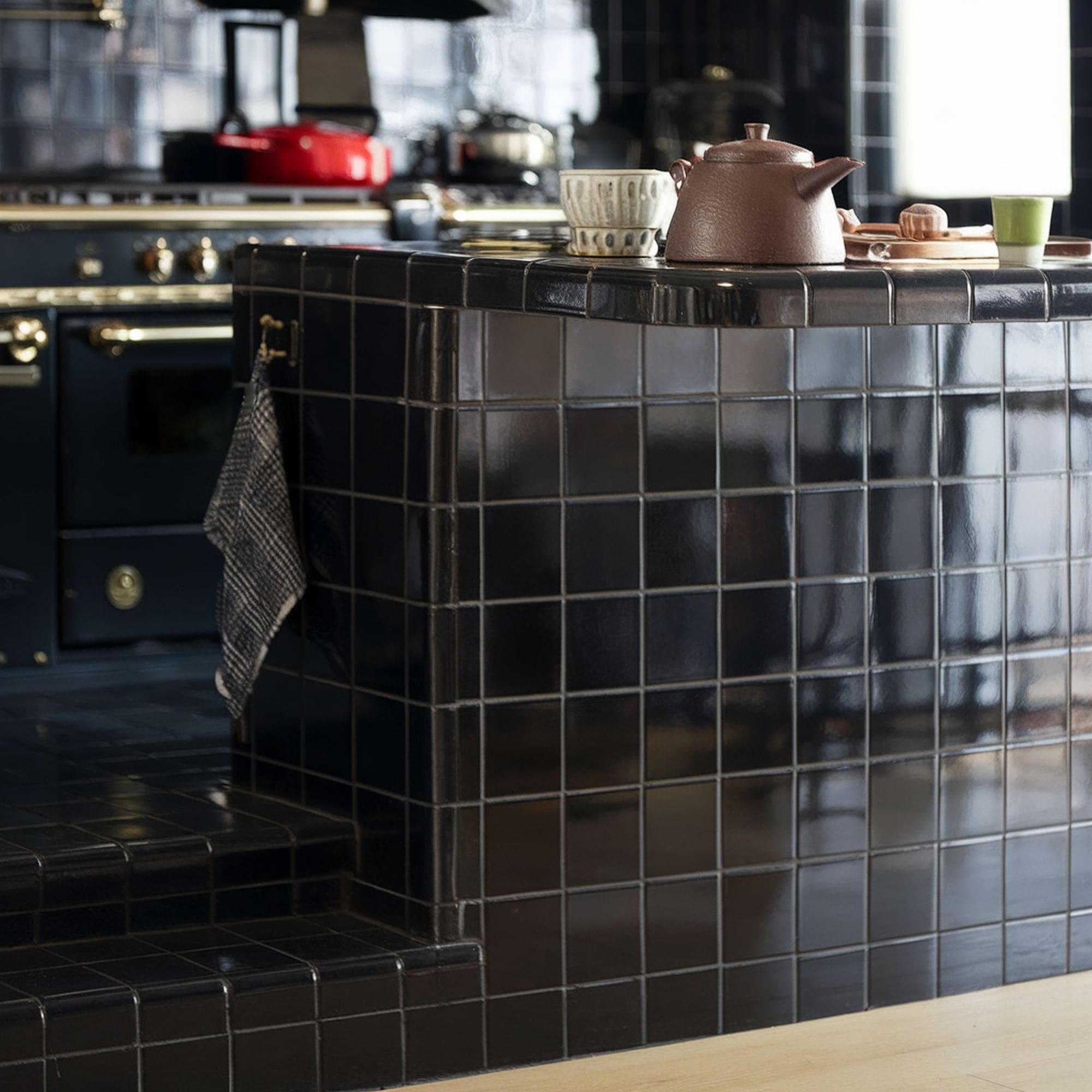 Anyone who wants to design a luxurious kitchen needs to consider this kind of glossy tile countertop. Black kitchens can feel elegant but may appear too dark for some people. Thanks to the reflective sheen of these tiles, you can take advantage of striking glossiness that enhances the premium aesthetic of the entire kitchen. This countertop manages to look both futuristic and retro at the same time.