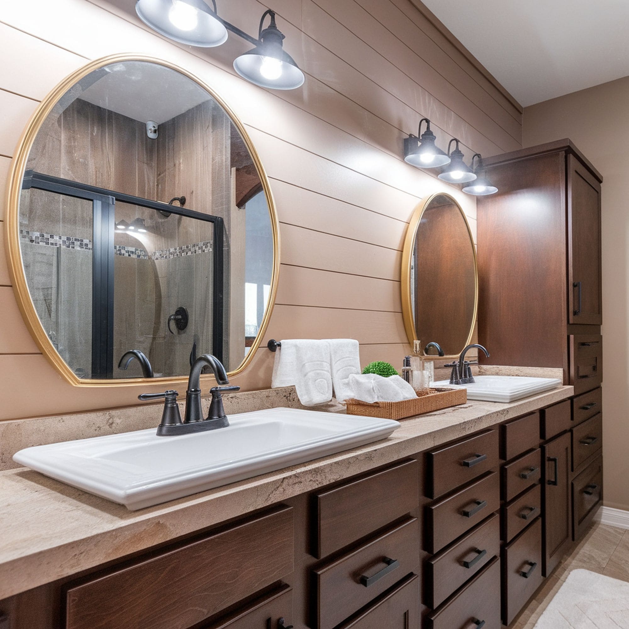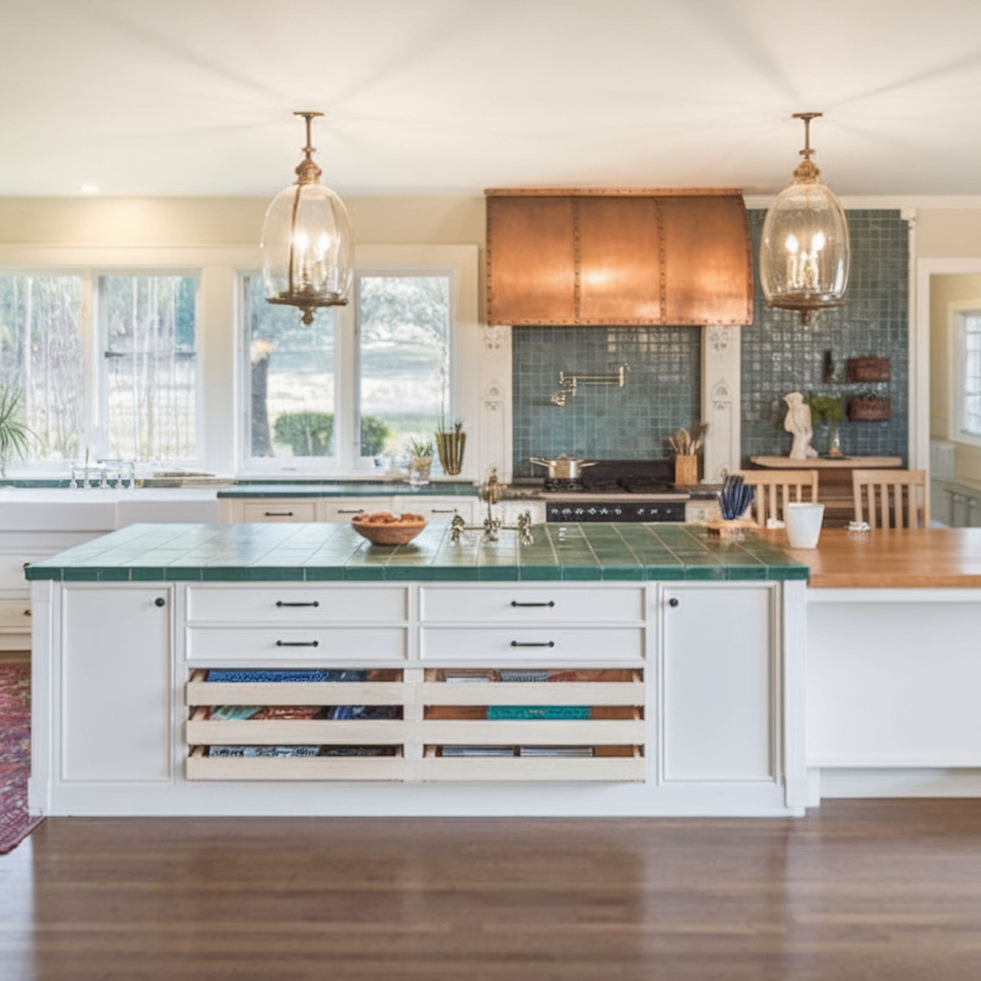 Aside from the generous countertop space, the same material is used for the kitchen backsplash to form a cohesive look. The chosen shade of green seems fitting when combined with the copper accents on the range hood and gold elements of the lighting fixtures. The porcelain tile brings some fresh style to this otherwise neutral-looking kitchen.