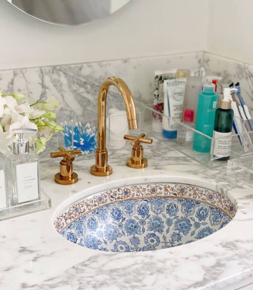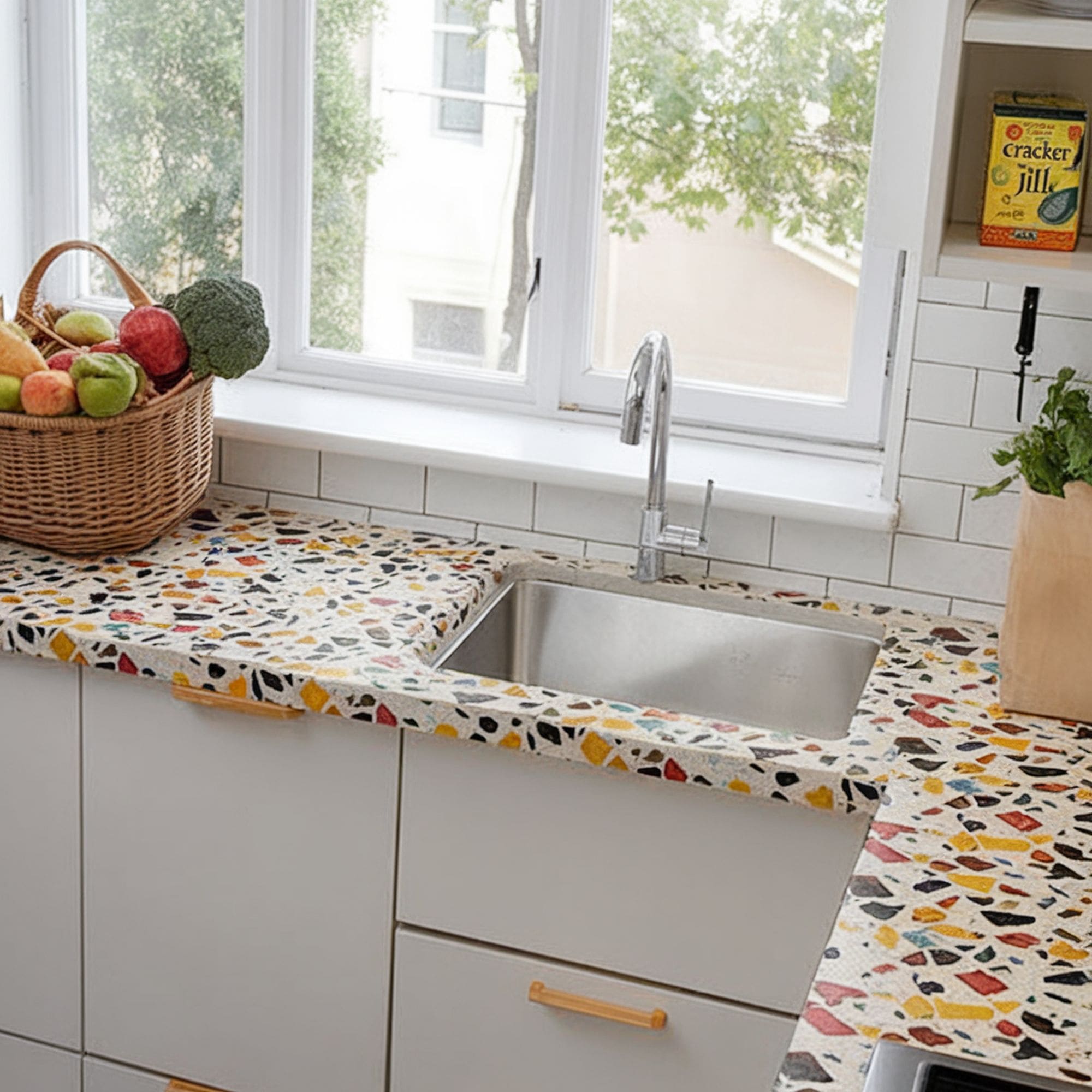 Bringing a splash of fun color to the countertop can be done with the help of many materials and designs. If basic tiles aren’t that exciting to you, there’s also the possibility to opt for a more innovative blend of patterns and textures through a broken tile mosaic style. This look can appear a little too bold for functional areas such as kitchens. It’s recommended to temper the aesthetic using more neutral-toned accessories and minimalist elements. Simple white tiles for the backsplash offer the right contrast to this dazzling countertop.