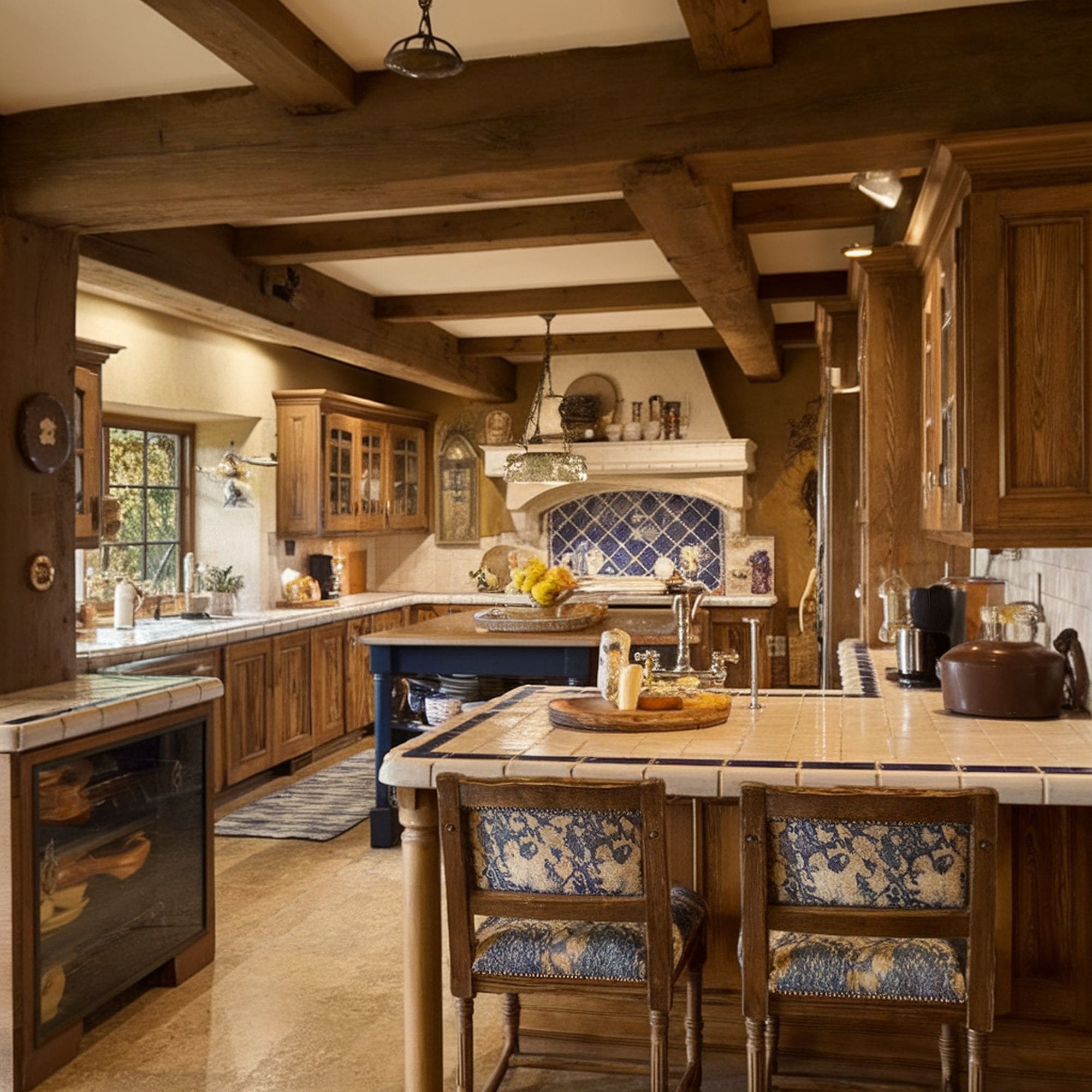 Consider choosing a neutral color scheme if you prefer a timeless look for the kitchen. The large beige tiles on this countertop contribute to the overall Old World vibe. Notice how other details of the kitchen provide a similar visual effect through architectural elements or the traditional kitchen backsplash. Keep in mind that natural stone tiles require proper sealing to avoid durability problems.
