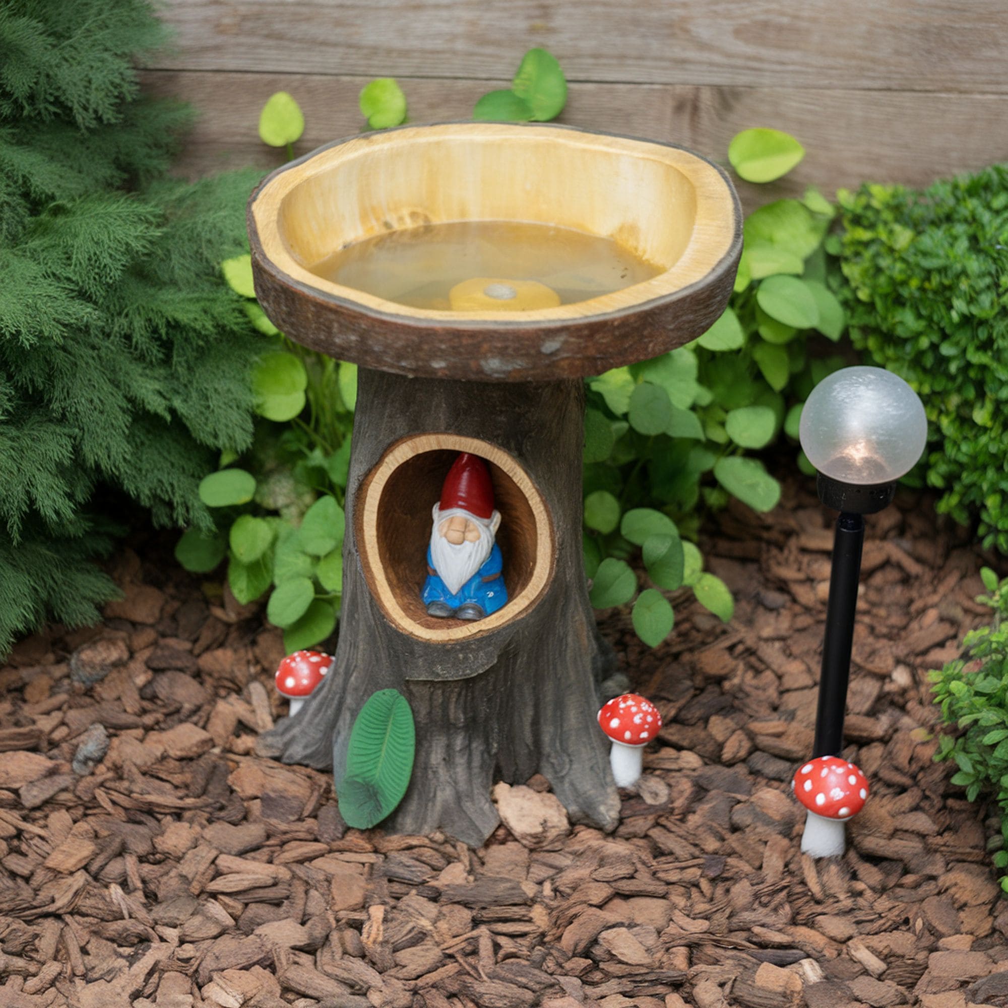 A sturdy stump can be transformed into a stand for our little feathered friends. Store water in an old basin if you are on a budget – otherwise, you may find different types of solar fountains on the market. This will attract many birds in your garden, especially if your climate is hot.