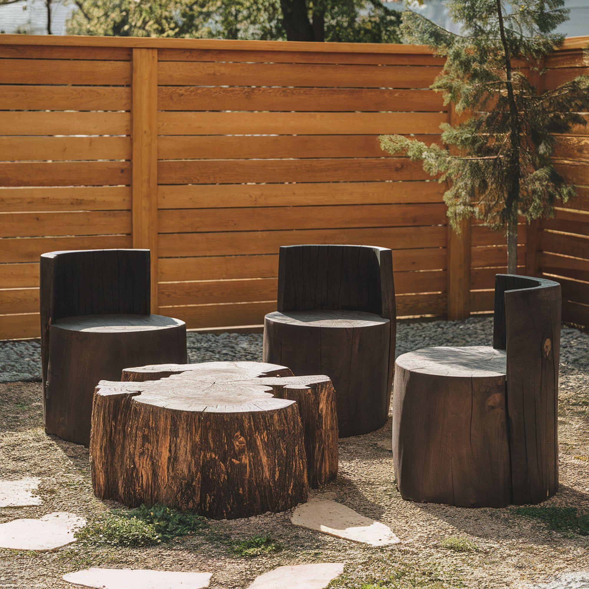 If you prefer a more serious, conservative look, you can take advantage of massive tree stumps and turn them into a useful set of chairs and table. The table base is thinned out in order to have plenty of legroom, while the tabletop is much thicker for support. Each chair has an inclined backseat, mimicking the shape of a standard chair. This is a beautiful DIY project if you want to create a cozy, relaxing spot in your garden.