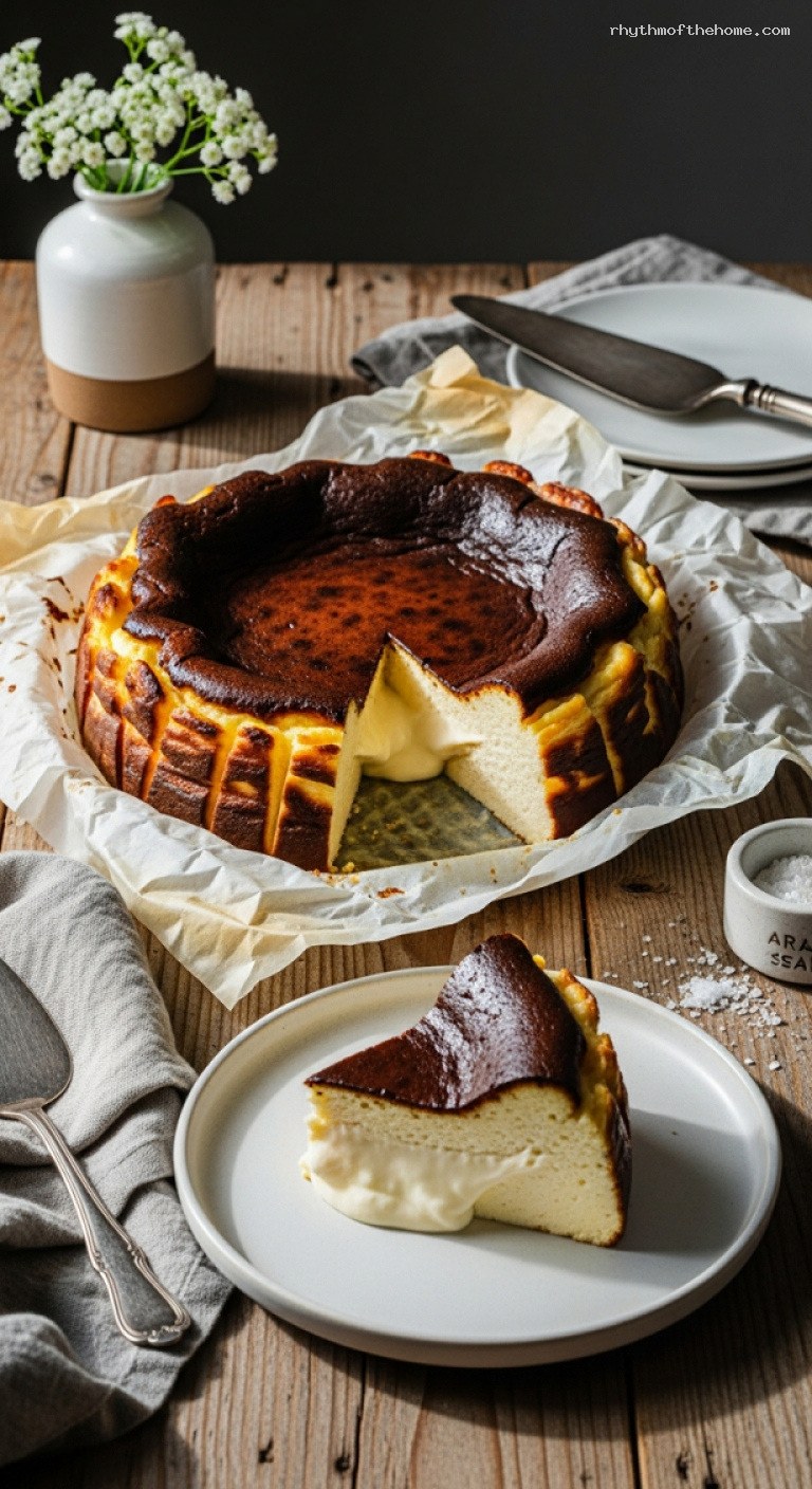- Mini Basque cheesecakes: Divide the batter among 8–10 parchment-lined mini springform pans or large muffin tins. Bake at the same temperature but check at 18–22 minutes. Great for individual servings.