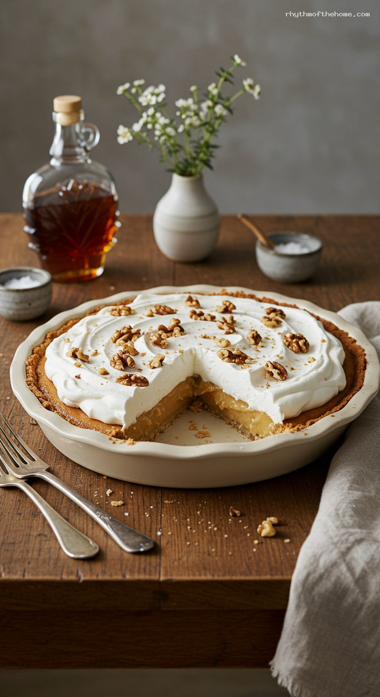Beat the remaining 1 cup cold cream with 1 tbsp maple syrup, 1 tsp vanilla, and a pinch of salt to soft peaks. Swirl over the chilled pie. Top with toasted walnuts and a tiny sprinkle of flaky salt. Slice with a hot, dry knife and serve.