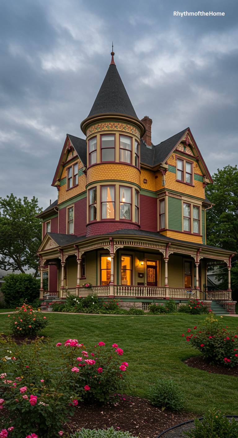 This magnificent Queen Anne Victorian home is a symphony of color against the moody twilight sky. Its complex facade features a prominent rounded turret, bay windows, and intricate gables, all painted in a rich palette of mustard yellow, deep burgundy, and forest green. Warm light glows from within, highlighting the elegant curtains and hinting at a cozy interior. A wraparound porch invites leisurely evenings, while a beautiful rose garden in the foreground adds a touch of romantic charm. This home is a perfect example of the “Painted Lady” style, exuding historical grandeur and welcoming warmth.