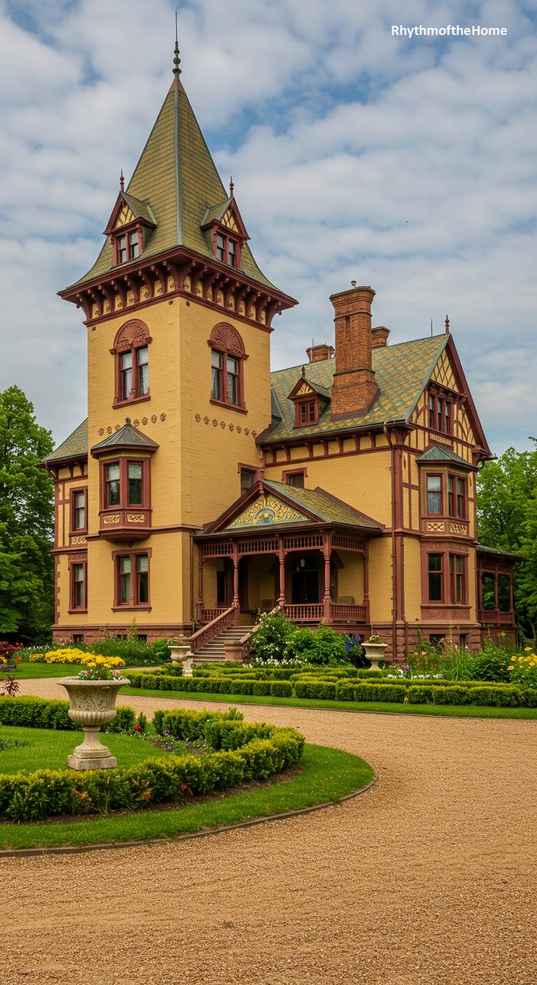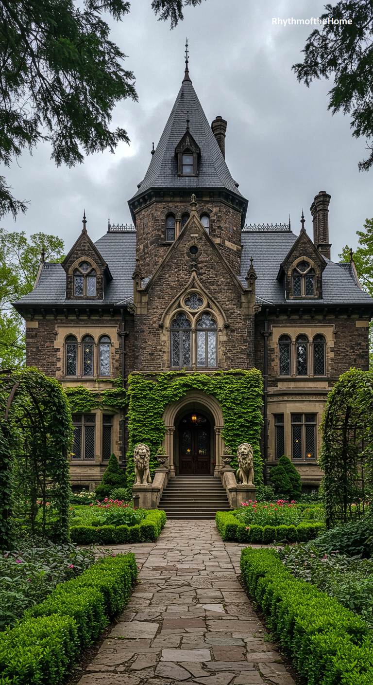 This distinguished Gothic Revival Victorian home has the stately and scholarly air of a small college building or a headmaster’s residence. Its dark, rough-cut stone facade is softened by climbing ivy, while pointed-arch windows add to its ecclesiastical feel. Two stone lion statues stand sentry on either side of the steps leading to the entrance. The surrounding gardens are formal and well-tended, with neat box hedges and stone pathways, reinforcing the sense of order, tradition, and intellectual pursuit.