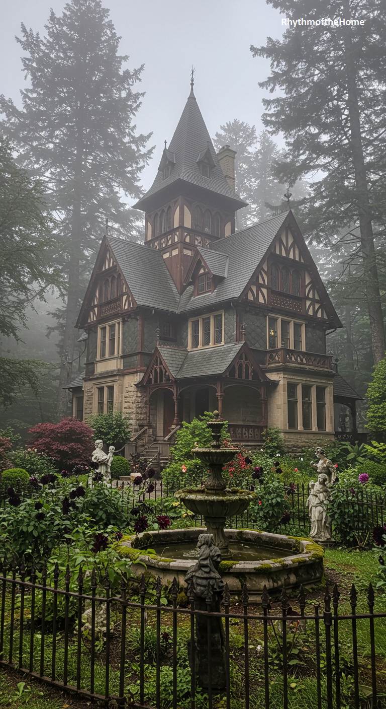 This enchanting Tudor-style Victorian home appears like a phantom in the dense, foggy woods. Its mixture of stone, stucco, and half-timbering gives it a substantial, old-world feel, while the steep gables and towers reach into the mist. In the foreground, a moss-covered fountain and classical statues stand amidst a garden of dark, velvety flowers, enhancing the romantic and slightly melancholic atmosphere. The home feels secluded and mysterious, a hidden gem for those who appreciate gothic beauty and the quiet solitude of the forest.